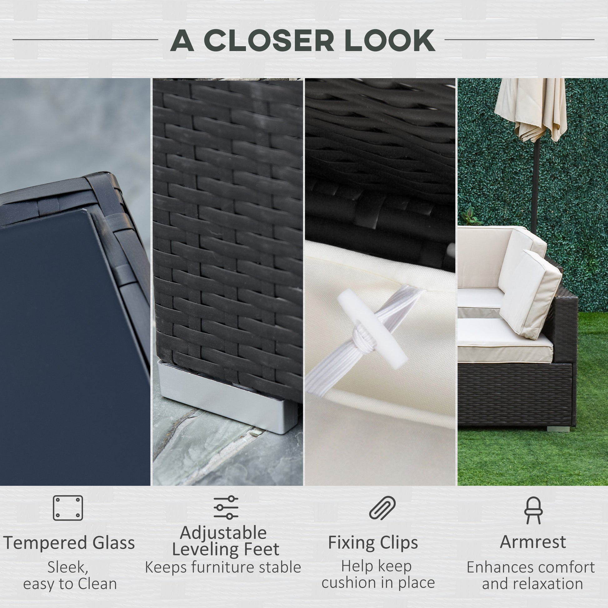 Bring beauty and comfort into your garden with this garden rattan furniture sets from Outsunny. Using steel for a stable and steady structure, each piece of the outdoor corner sofa is wrapped in PE wicker for double the durability. Padded seat and back cushions provide comfort, with two extra pillows included. The conservatory furniture is easy to assemble, with the buckle fastenings keeping all pieces secure. Set is completed with a safe tempered glass top on the table for a sleek look.