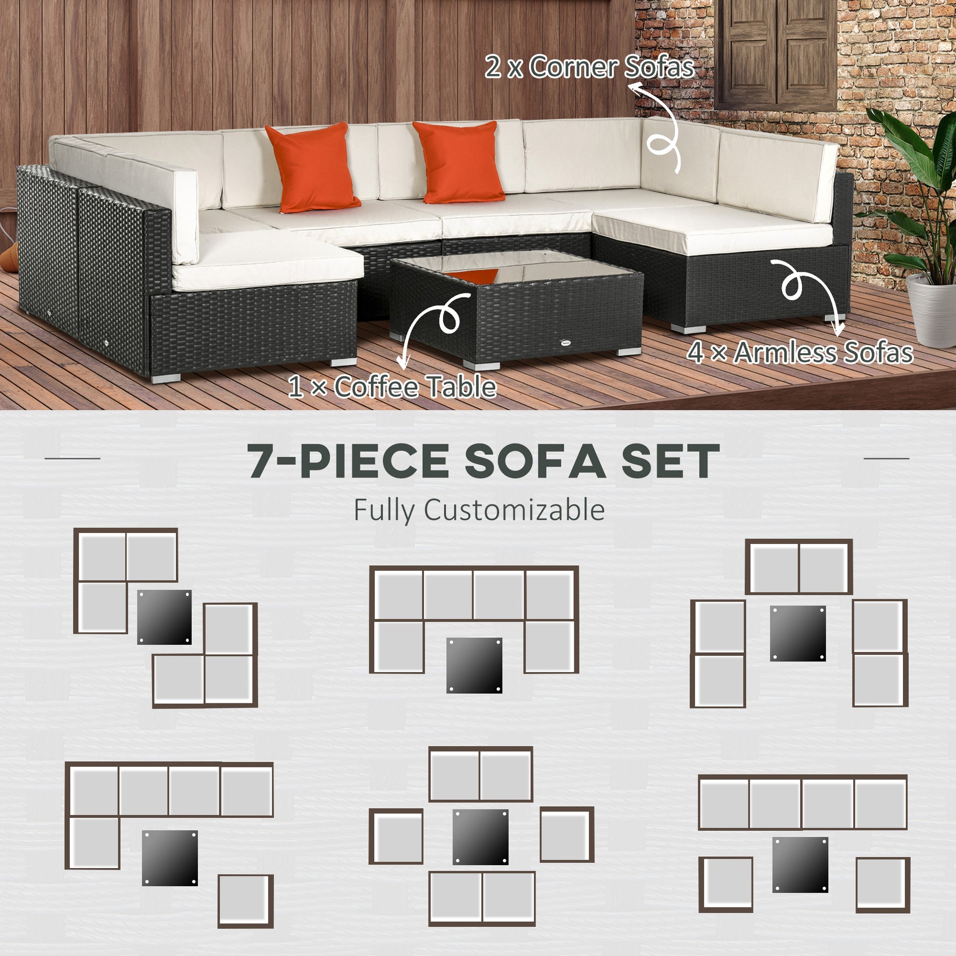 Outsunny 7 Piece Garden Rattan Furniture Set Outdoor Sectional Wicker Weave Sofa Seat Coffee Table w/ Cushion and Pillow Buckle Structure Dark Coffee
