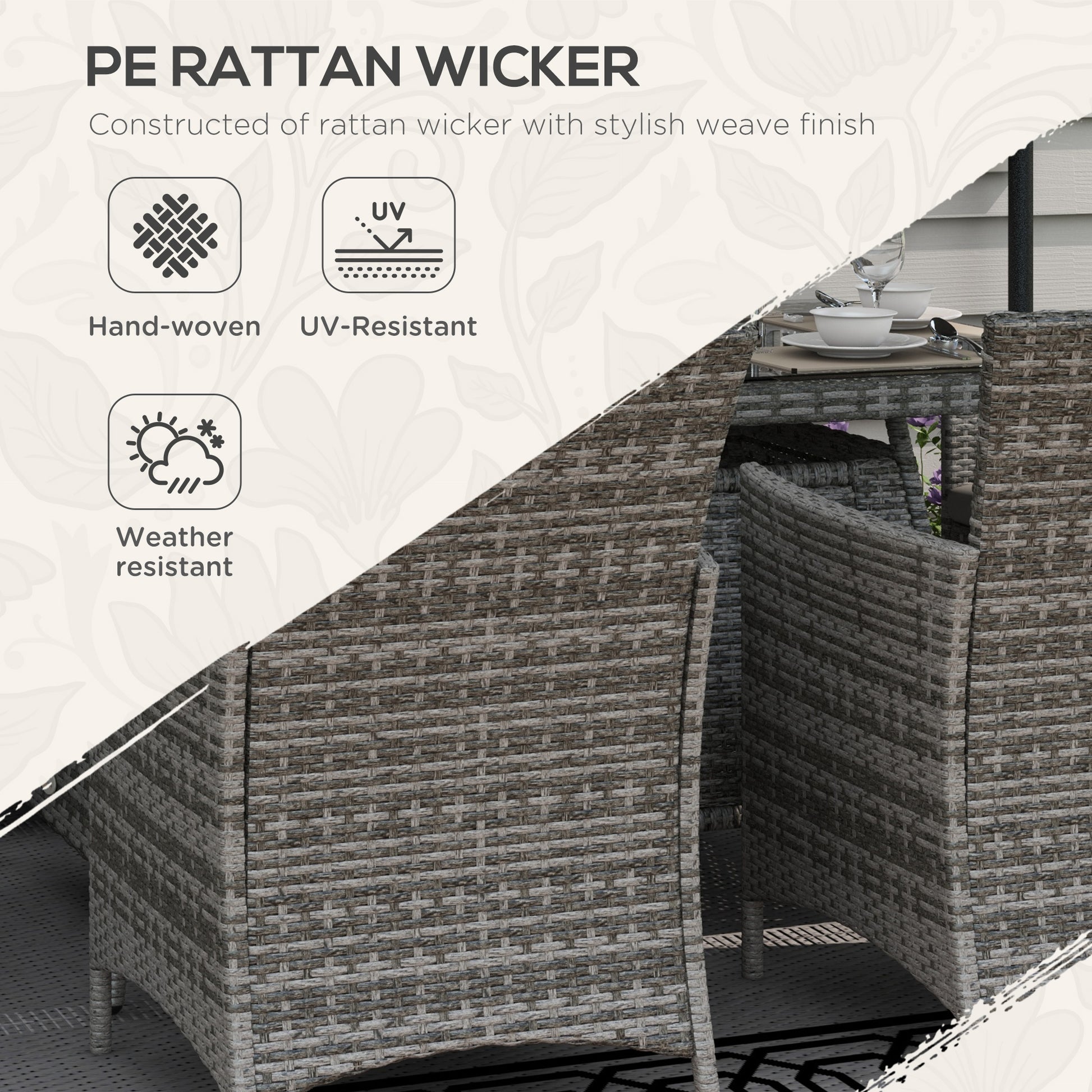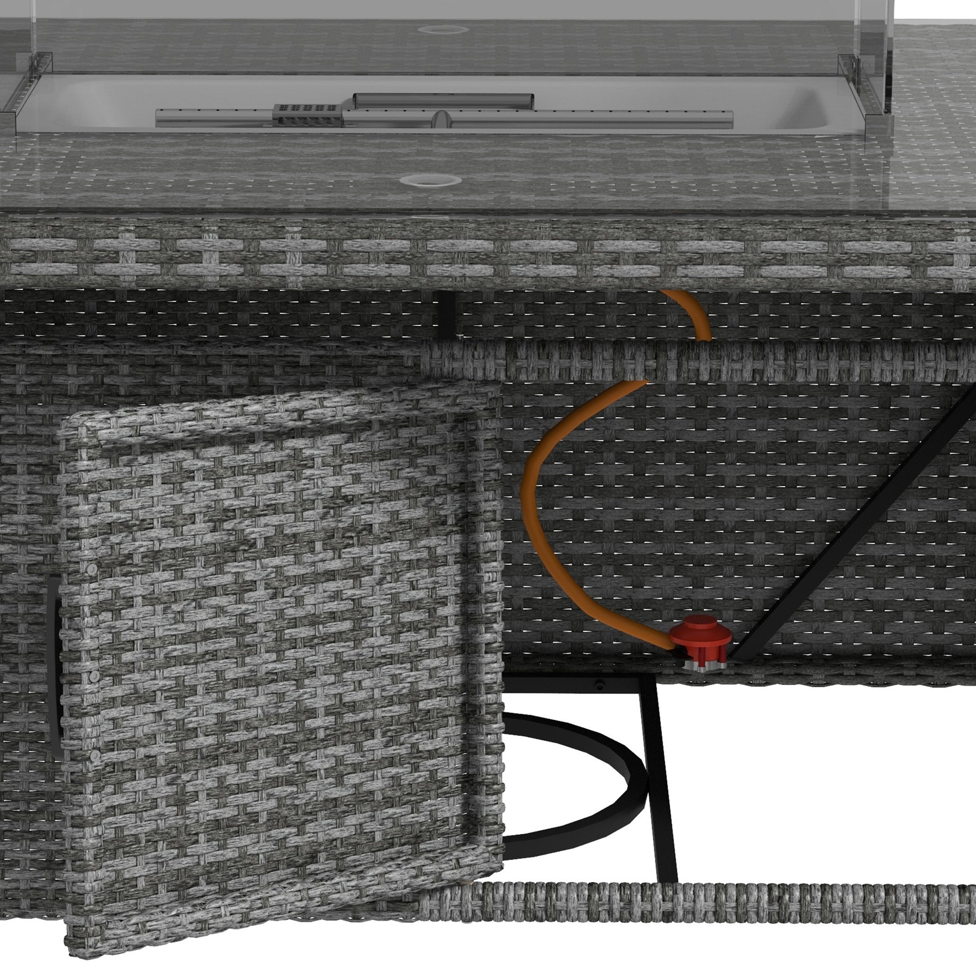 Gather round with company, with the great amount of warmth and ambience. This Outsunny dining set comes with six armchairs and a fire pit table. The table is fitted with a 50,000 BTU burner in the middle which expels a smokeless and clean burn to ensure a enjoyable and smokeless atmosphere. The glass windscreen creates a safe shield against the flame. All pieces have a strong metal frame with solid plastic wicker. Sink into comfort with the included padded seat cushions.