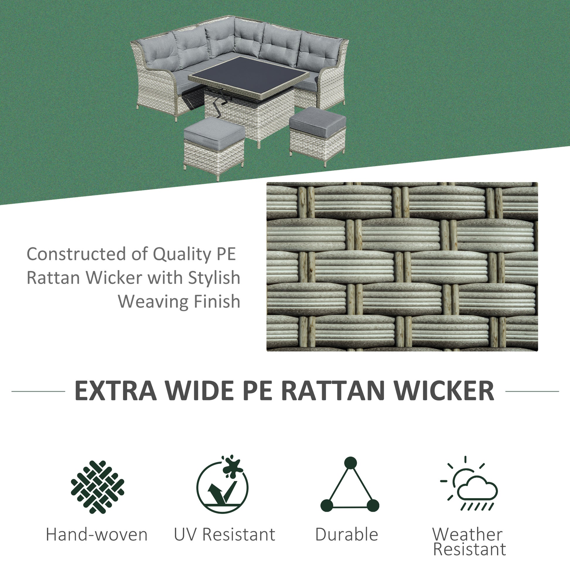 Outsunny 7-Seater Patio PE Rattan Corner Sofa w/ Adjustable Convertible Rising Table, Wicker Sectional Conversation Furniture w/ Cushions, Grey