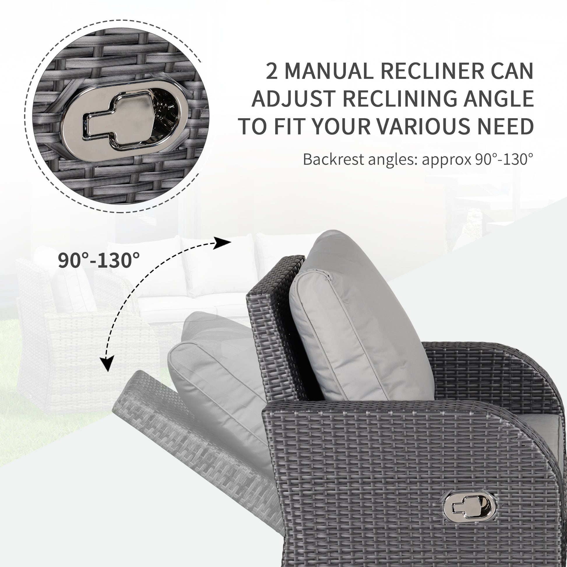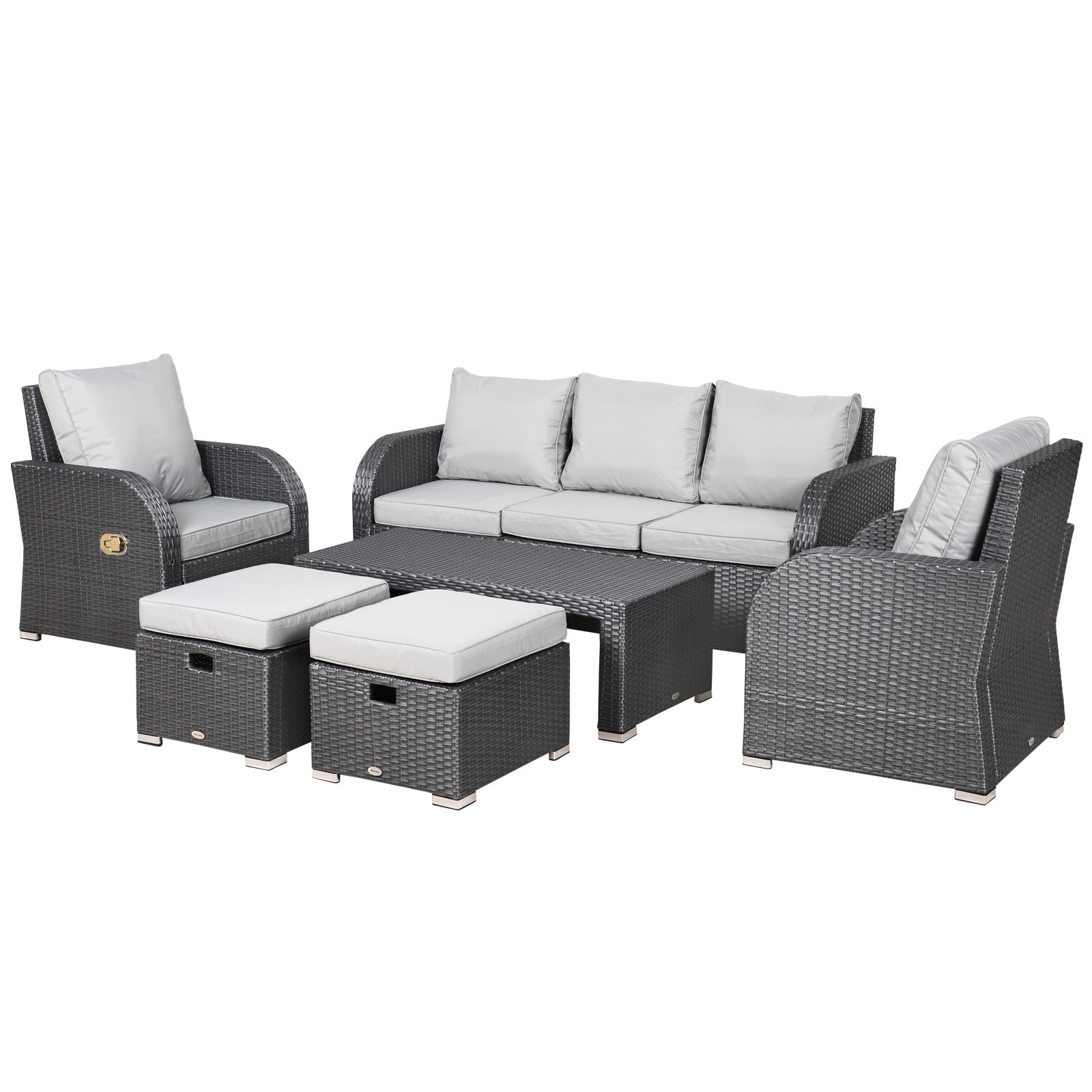 Outsunny 7-Seater Rattan Garden Furniture w/ Coffee Table Footstool Space-saving Patio Wicker Weave Reclining Chair Set, Light Grey