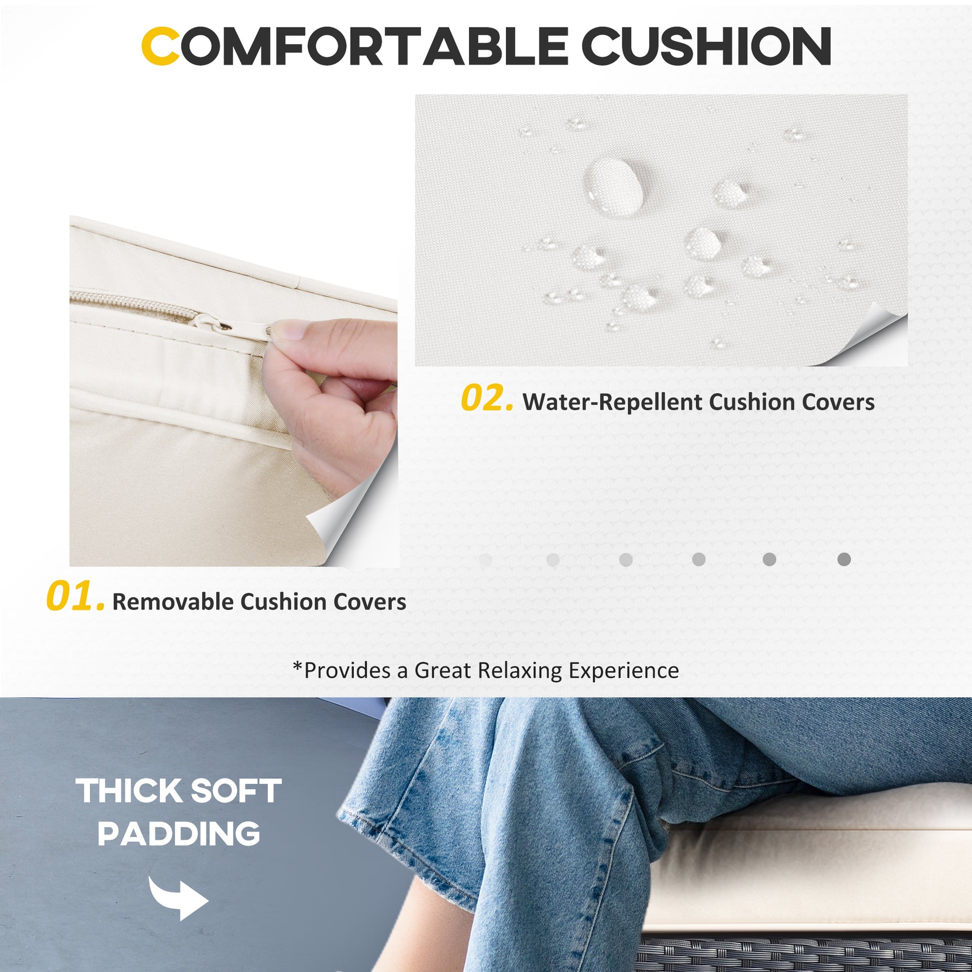 - Thick khaki seat and back cushions to sink in and relax