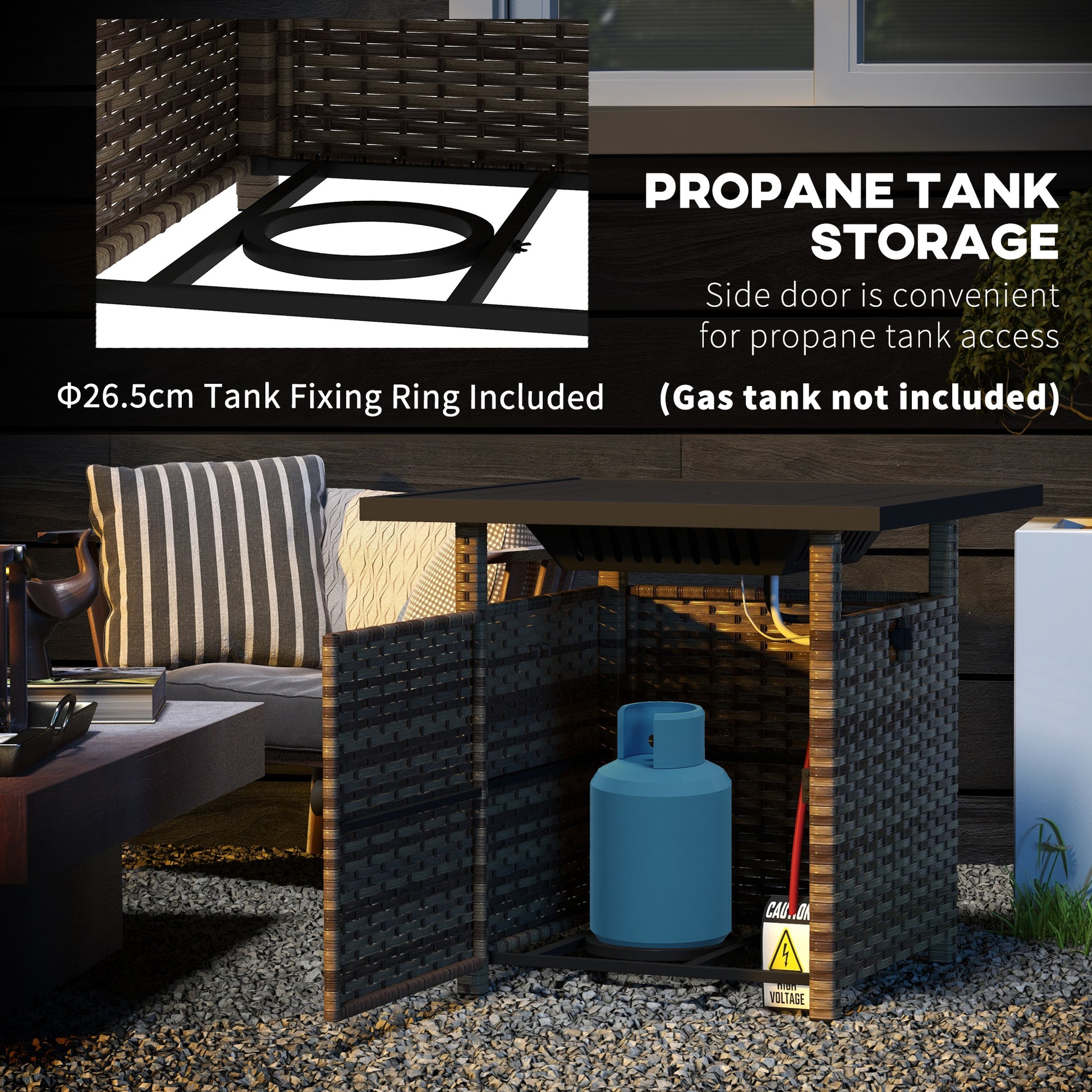 A place to keep warm - and a place to sit with company: this Outsunny fire pit table. The electric ignition system makes it easy to light, powered by propane gas. The 50,000 BTU heating output and CSA certified burner means plenty of heat, with the bottom cupboard to give the 5kg gas tank its own safe holding place.