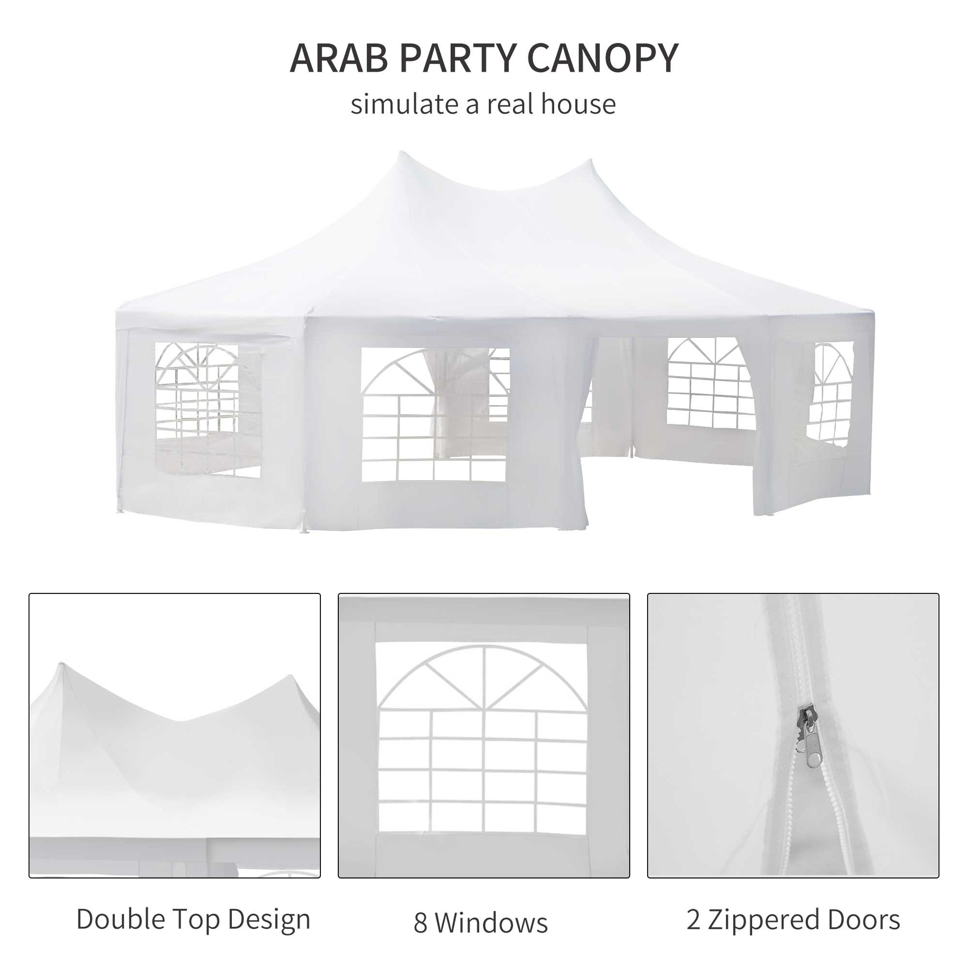 This Large 10 sided Outsunny party gazebo is a great item to have to create an extended area for any occasion or party. The whole structure is made of a steel frame with no internal columns, the side walls and window walls can easily be attached and removed using elastic ball attachments. Each of the side panels can be strapped down or tied back to let air and sunlight in. This is a great product and design for use in any occasion.