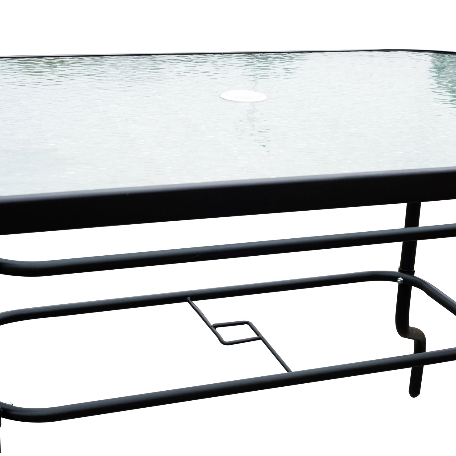 - The table features 5 mm tempered glass top and with a hole in the middle for installing umbrella which provides large sun shade.