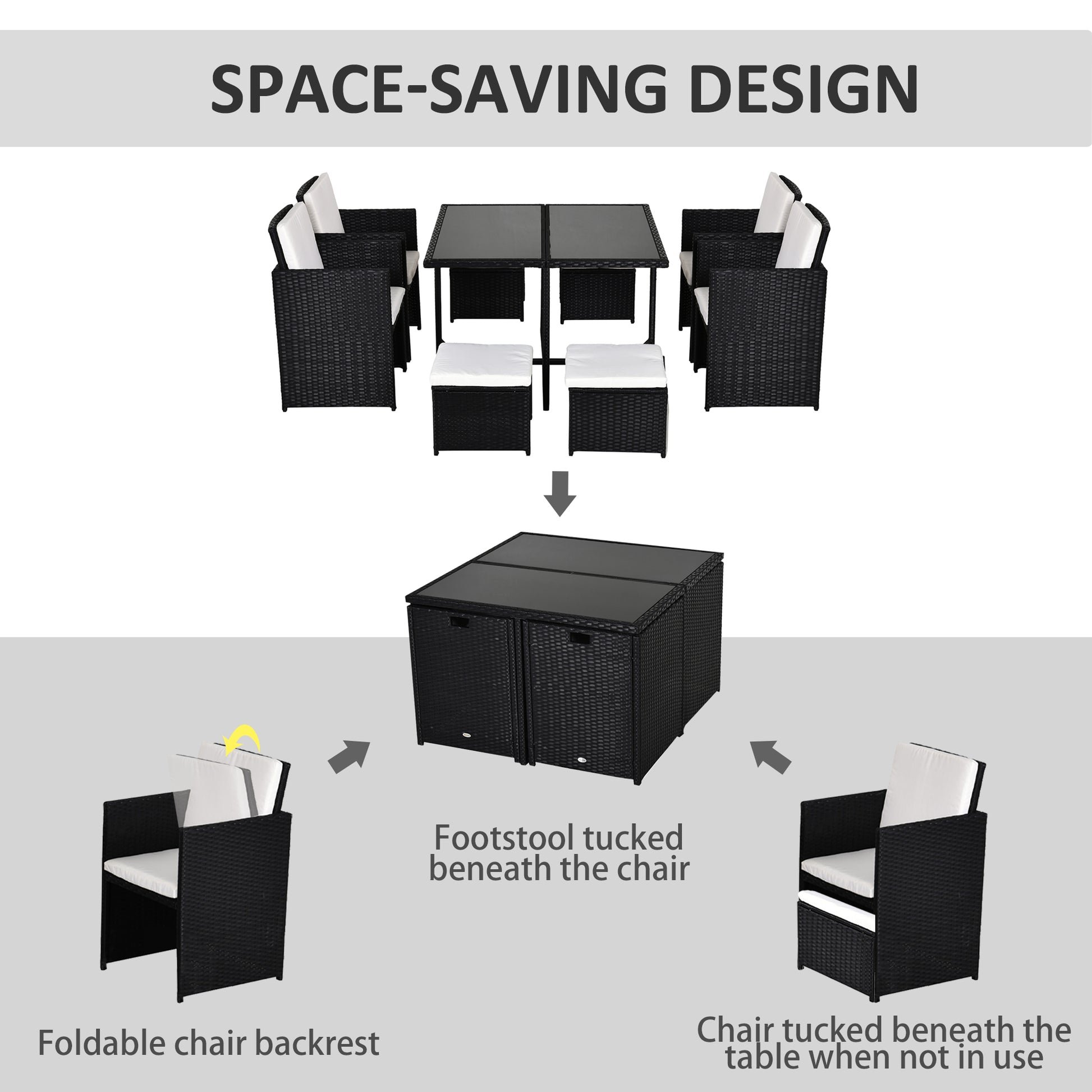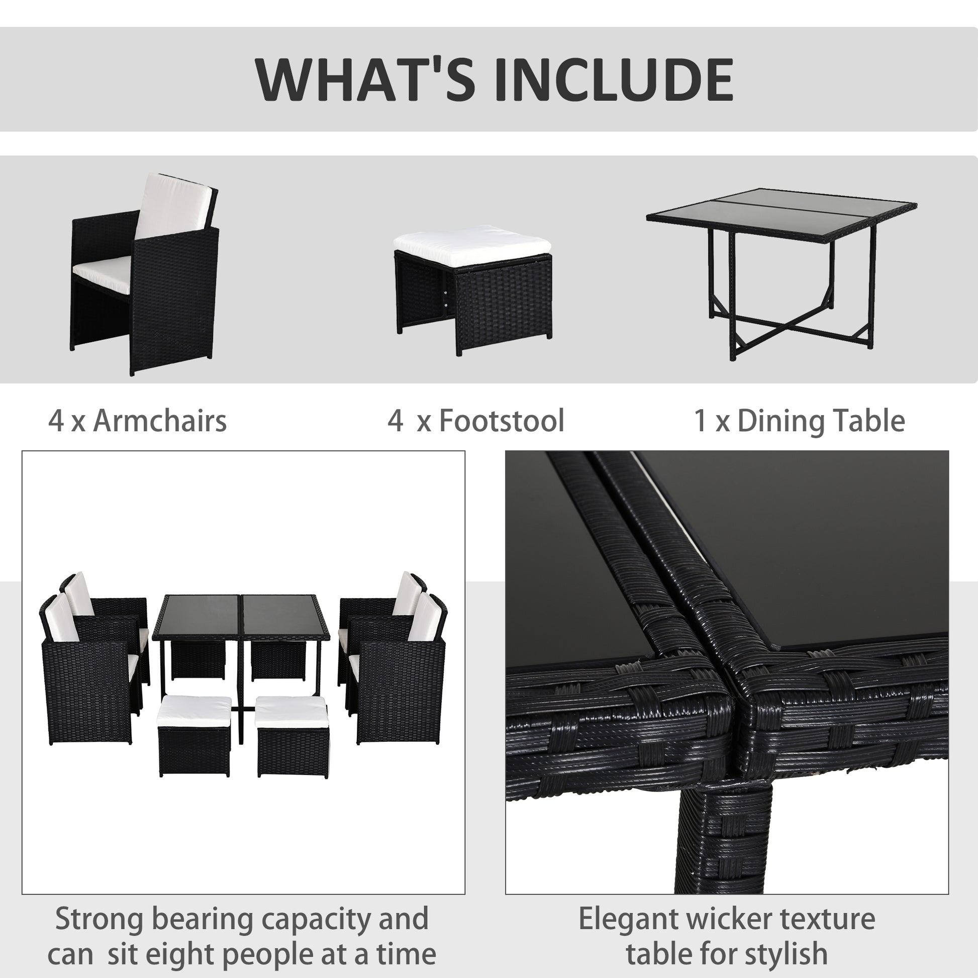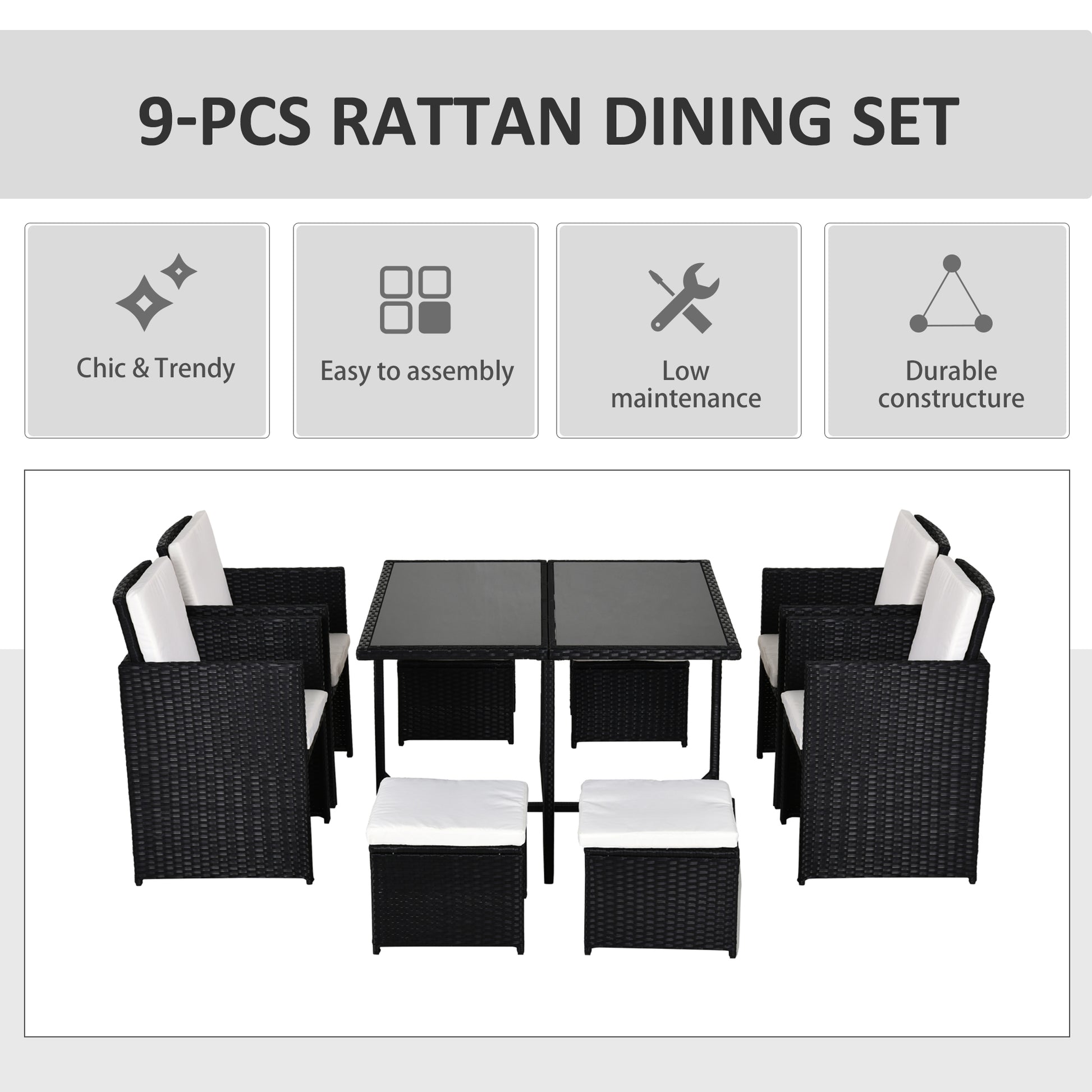 Outsunny 9 Piece Garden Rattan Dining Set Outdoor Patio Dining Table Set Weave Wicker 8 Seater Stool Black