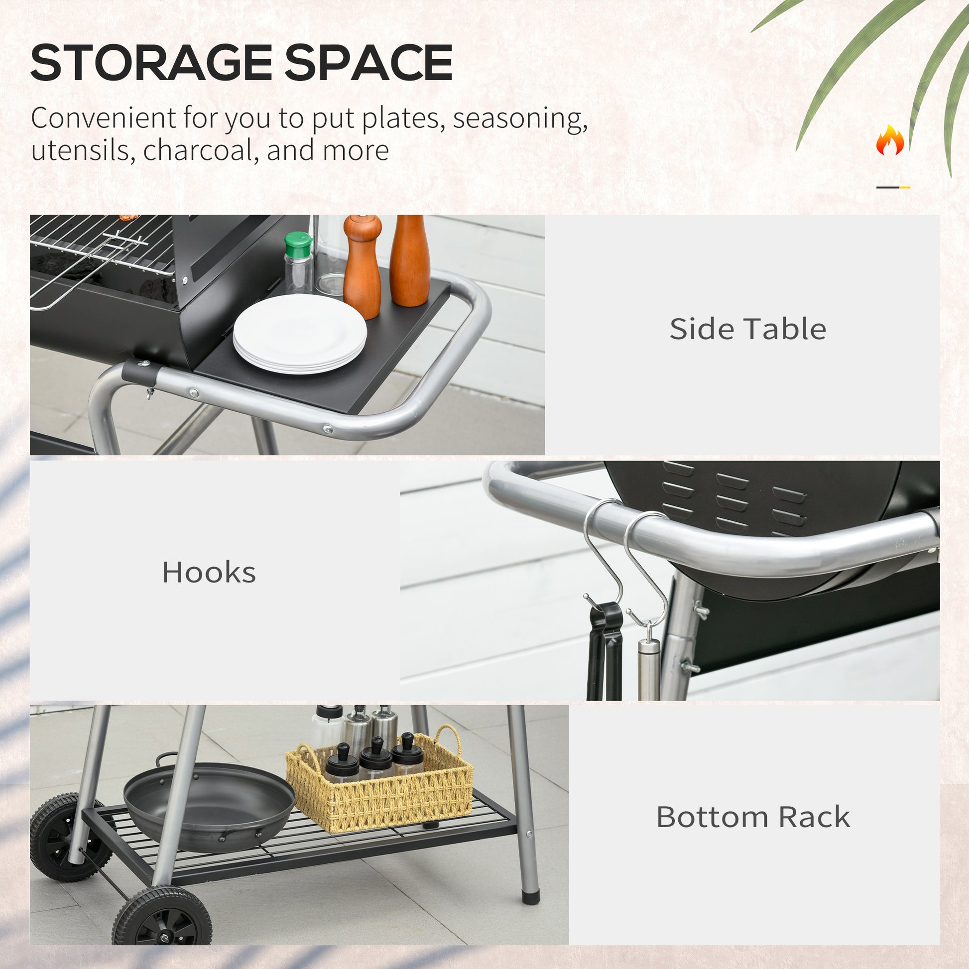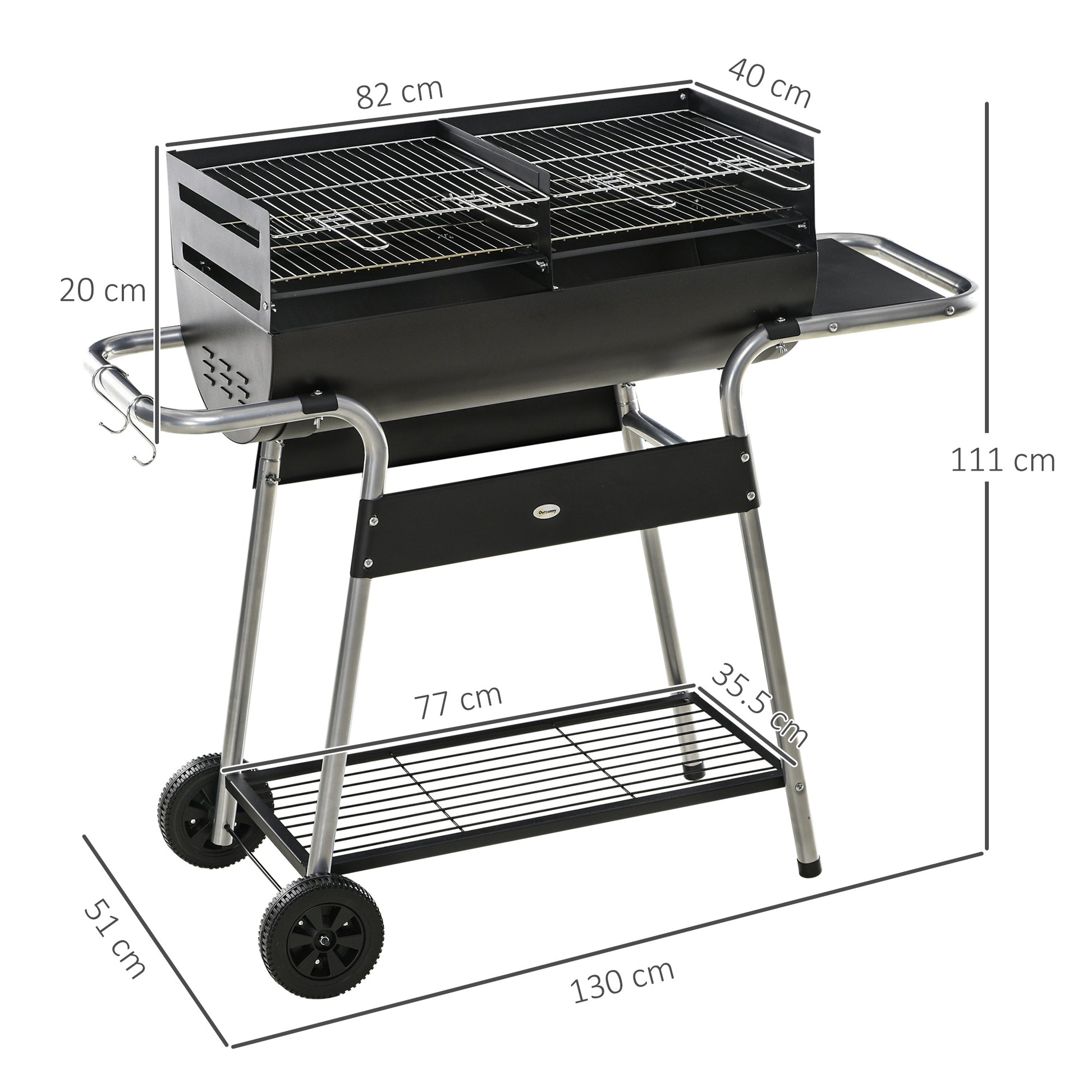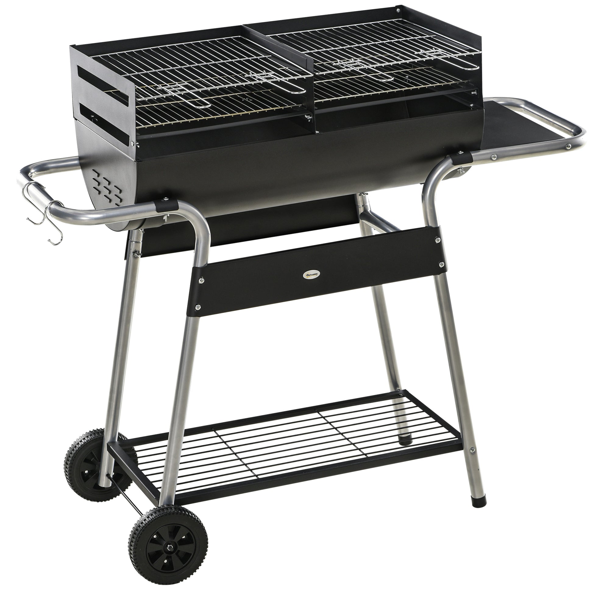 Outsunny Charcoal Barbecue Grill Garden BBQ Trolley w/ Adjustable Grill Height, Double Grill, Side Table, Storage Shelf and Wheels, Black