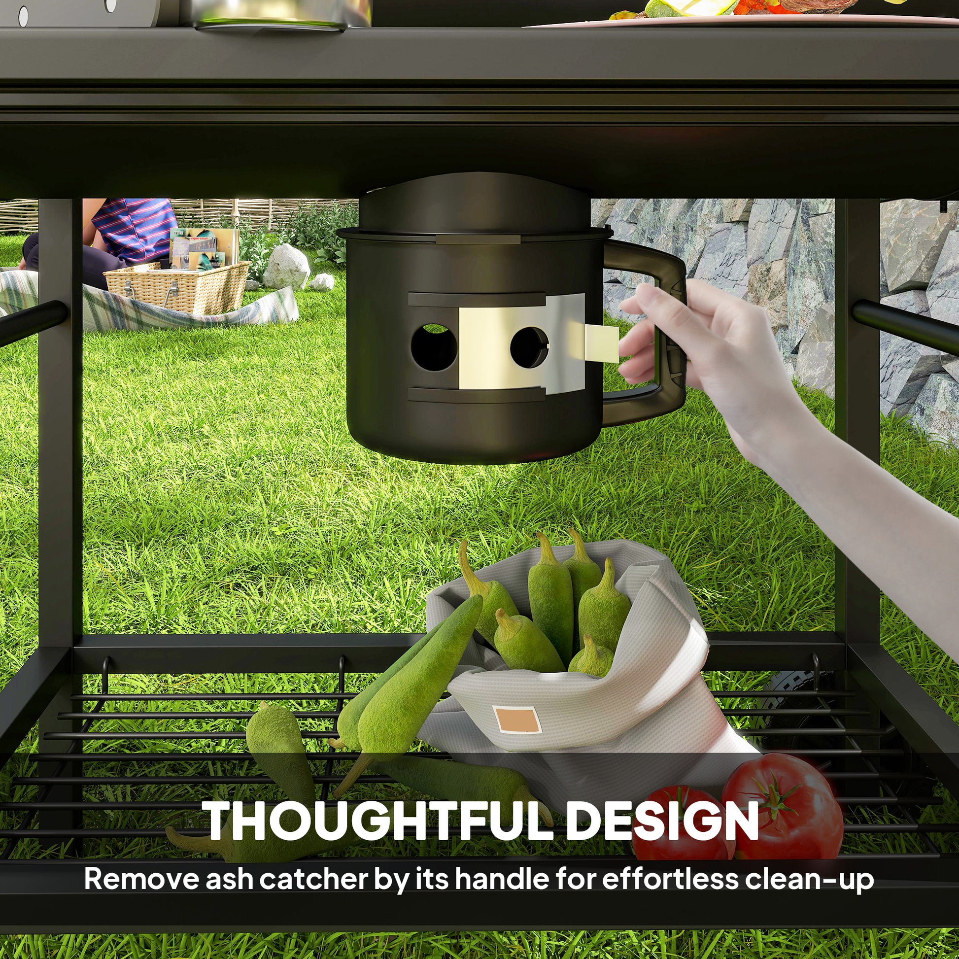Charcoal BBQ Grill with Foldable Front Side Shelf, Portable Barbecue Smoker with Warming Rack, Bottom Shelf, Lid, Temperature Gauge