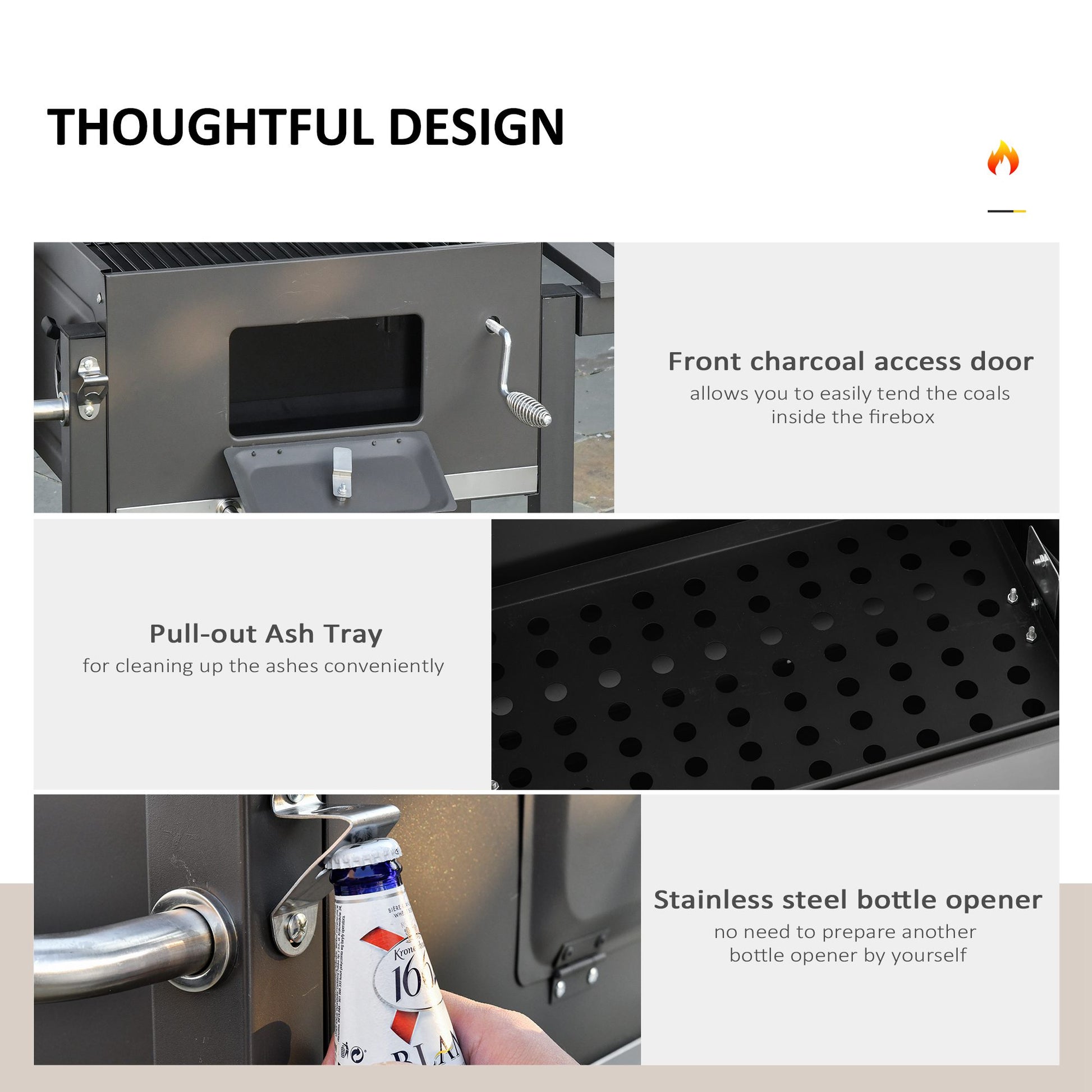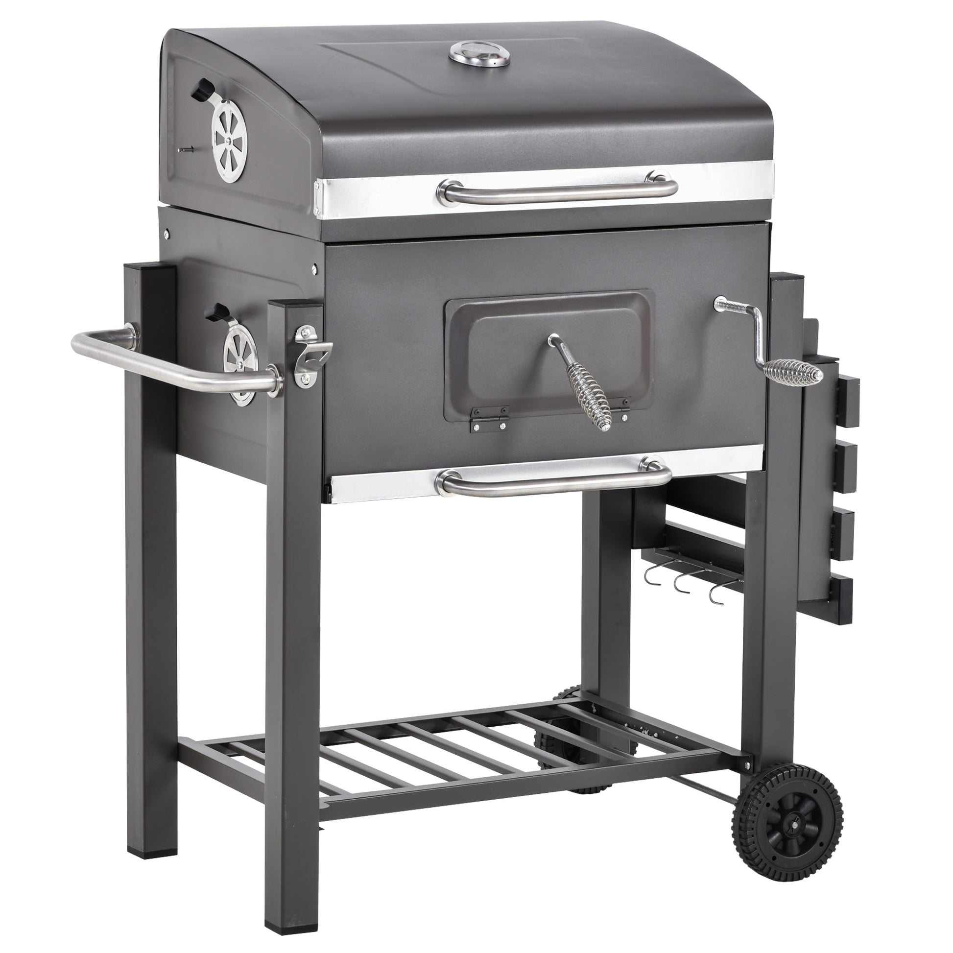 This BBQ from Outsunny is the perfect choice for when family and friends Formed from steel with a powder coating to ensure reliability and strength, it is made into a deluxe design, multiple functions in a single BBQ grill. A stainless steel handle opens the lid safely, with the side handle adjusting the height of the charcoal burning for smoking control of the food. A wheel and side handle finish this piece, making the outdoor barbecue effortlessly easy to move around.
