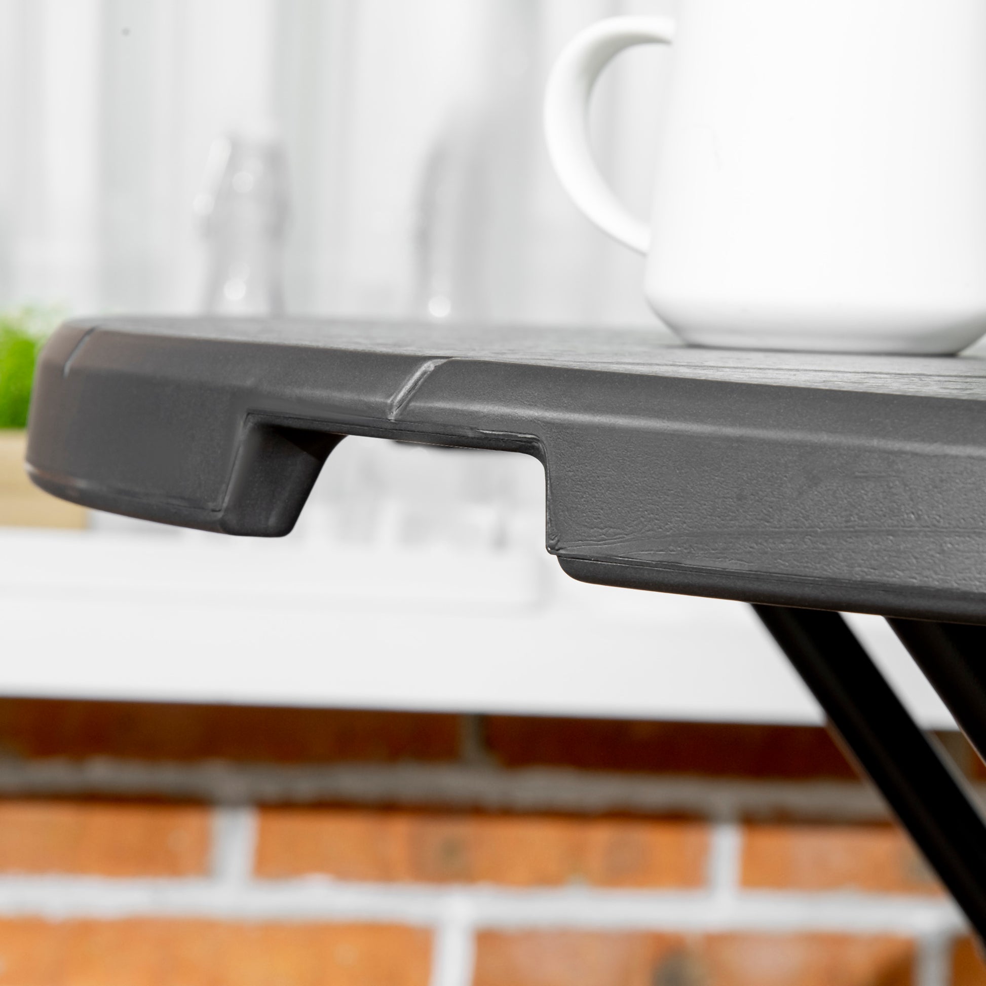 A folding outdoor dining table is a must for homes short on space. A four-seater size for you to sit with company, morning through to night. It features a steel frame for a strong structure - the frame is foldable so you can store it easily and bring it out whenever you need. A plastic tabletop for a sturdy base to dine from, formed into a wood-effect look for classic style.