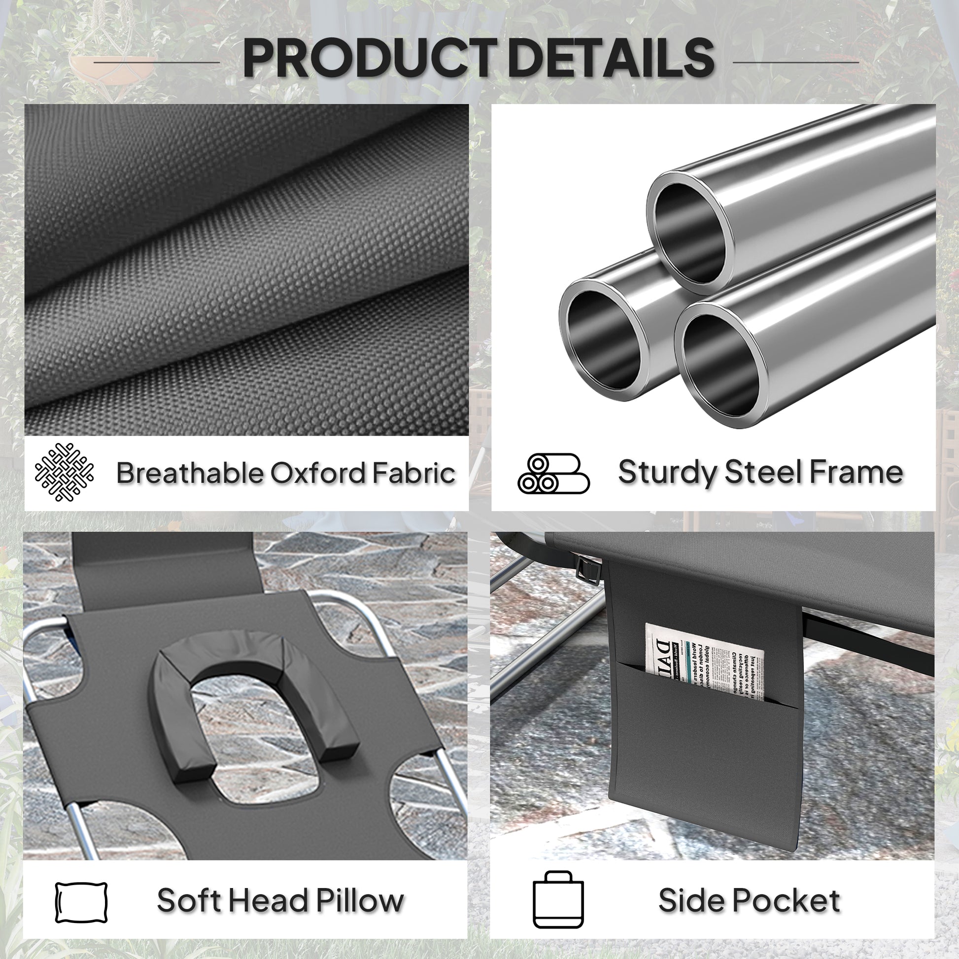A cool update on the foldable sun lounger set from Outsunny. Features a padded head hole at the front to allow you to rest your face in comfortably, which is perfect for relaxing or even reading a book! The powder coated steel frame is strong and solid to support up to 120 kg. The reclining backrest is five positions adjustable, easy to set and lock to a position you like best. Complete with a handy side pocket.