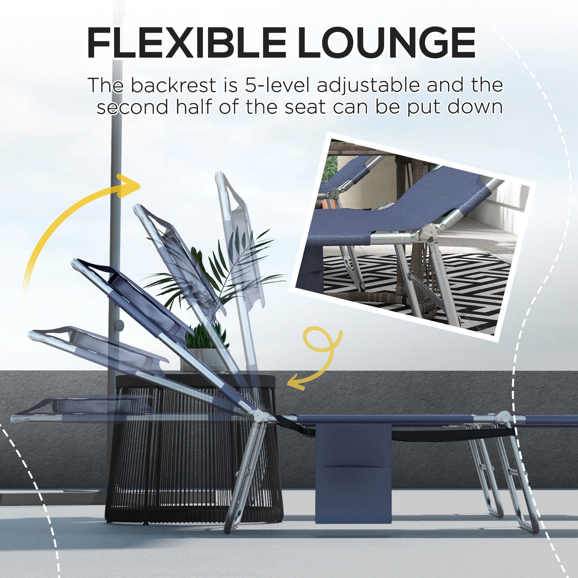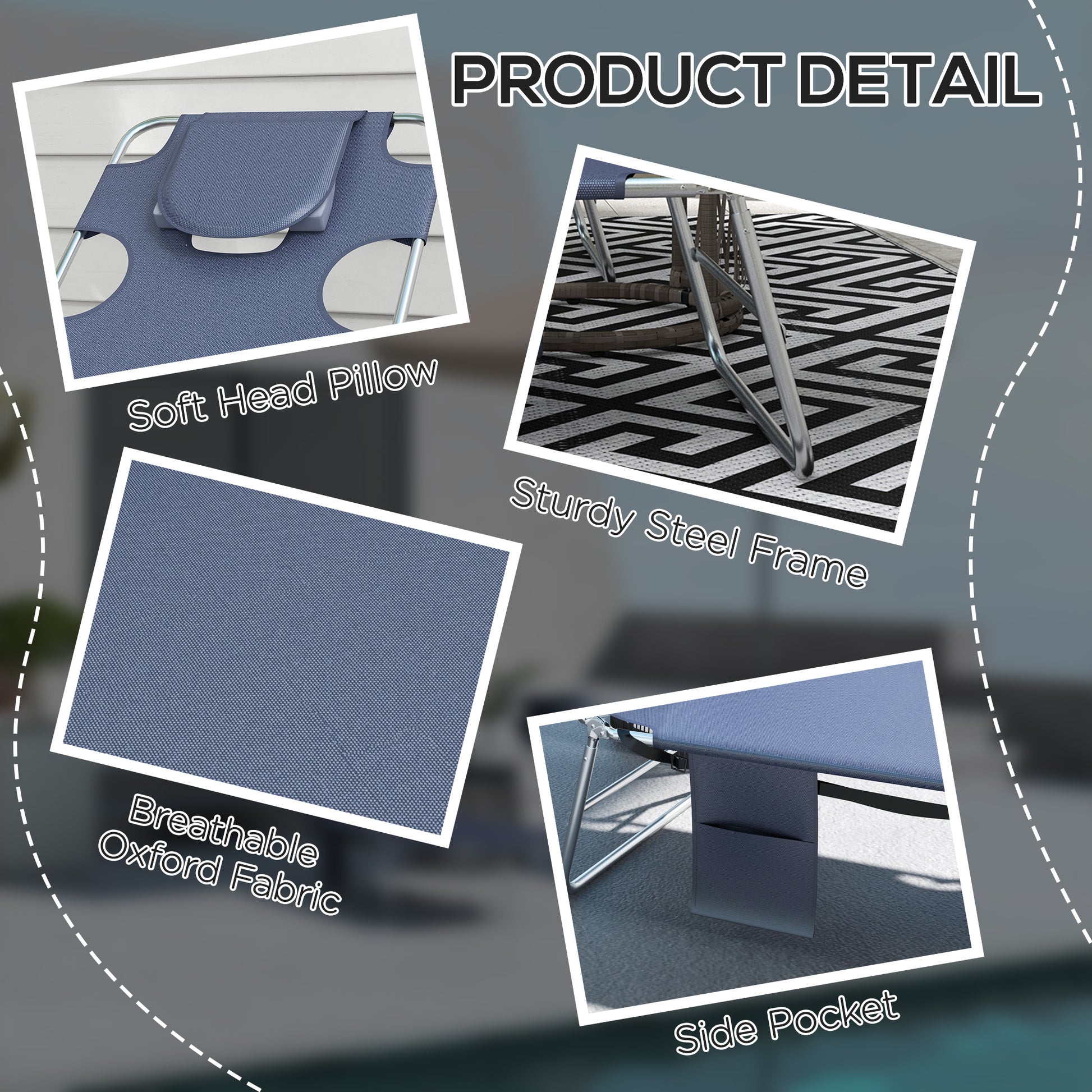 Outsunny Foldable Sun Lounger Set of 2 with Reading Hole, Portable Sun Lounger with 5 Level Adjustable Backrest, Reclining Lounge Chair with Side Pocket, Headrest Pillow, Grey