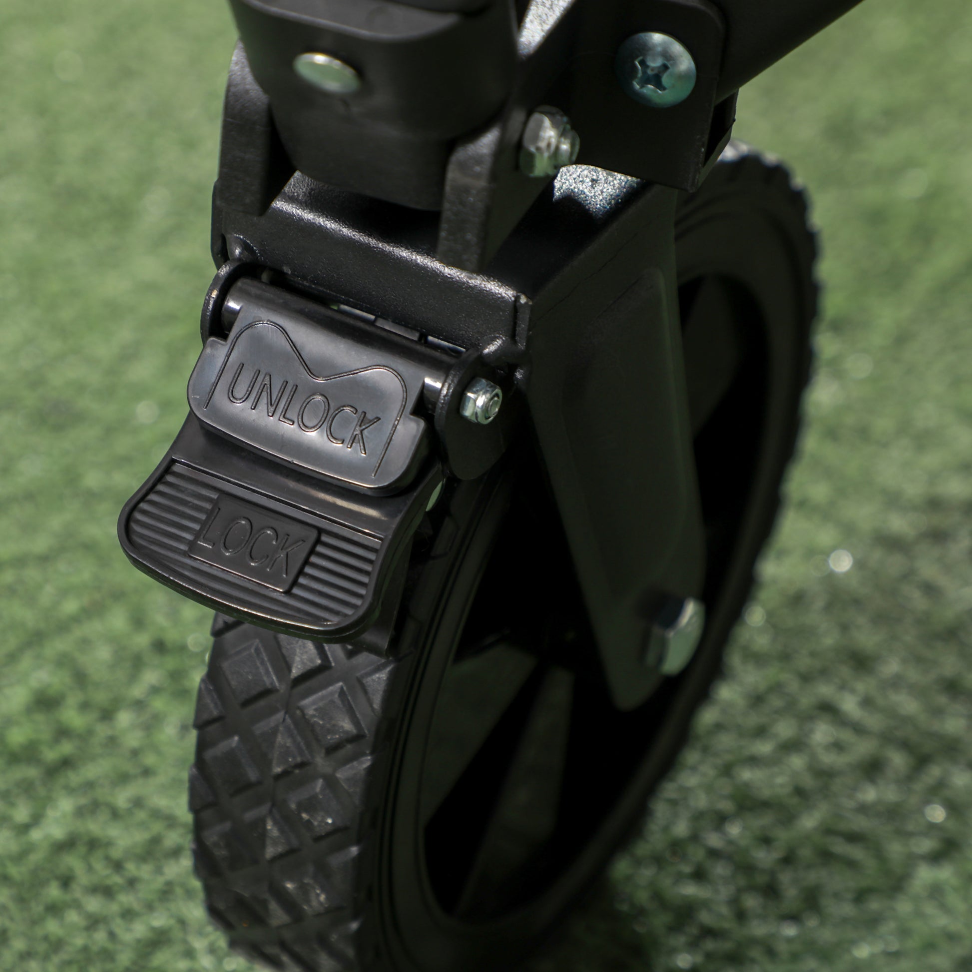 - Four wheels, two of which rotate around fully, two of which have brakes