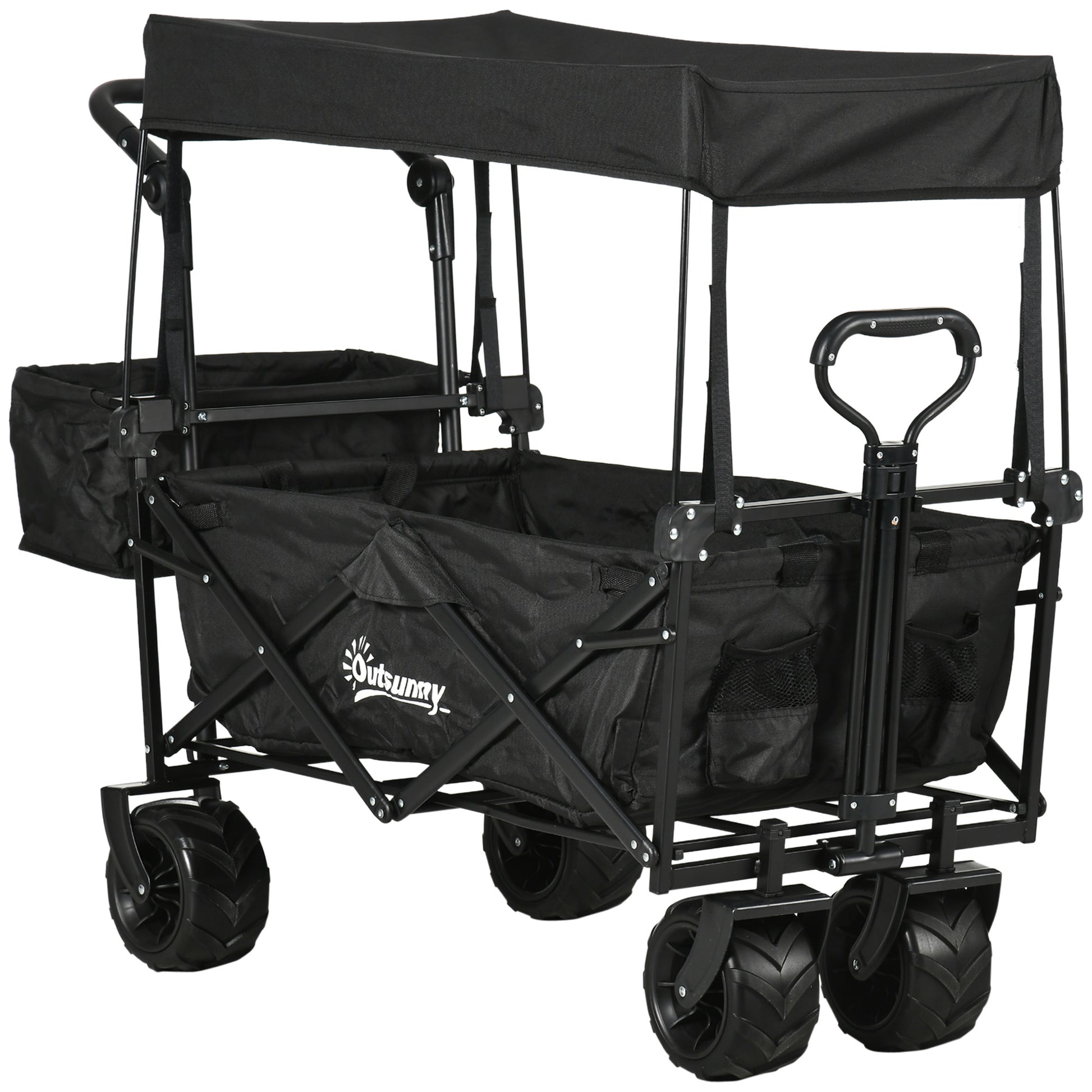 Outsunny Folding Trolley Cart Storage Wagon Beach Trailer 4 Wheels with Handle Overhead Canopy Cart Push Pull for Camping, Black