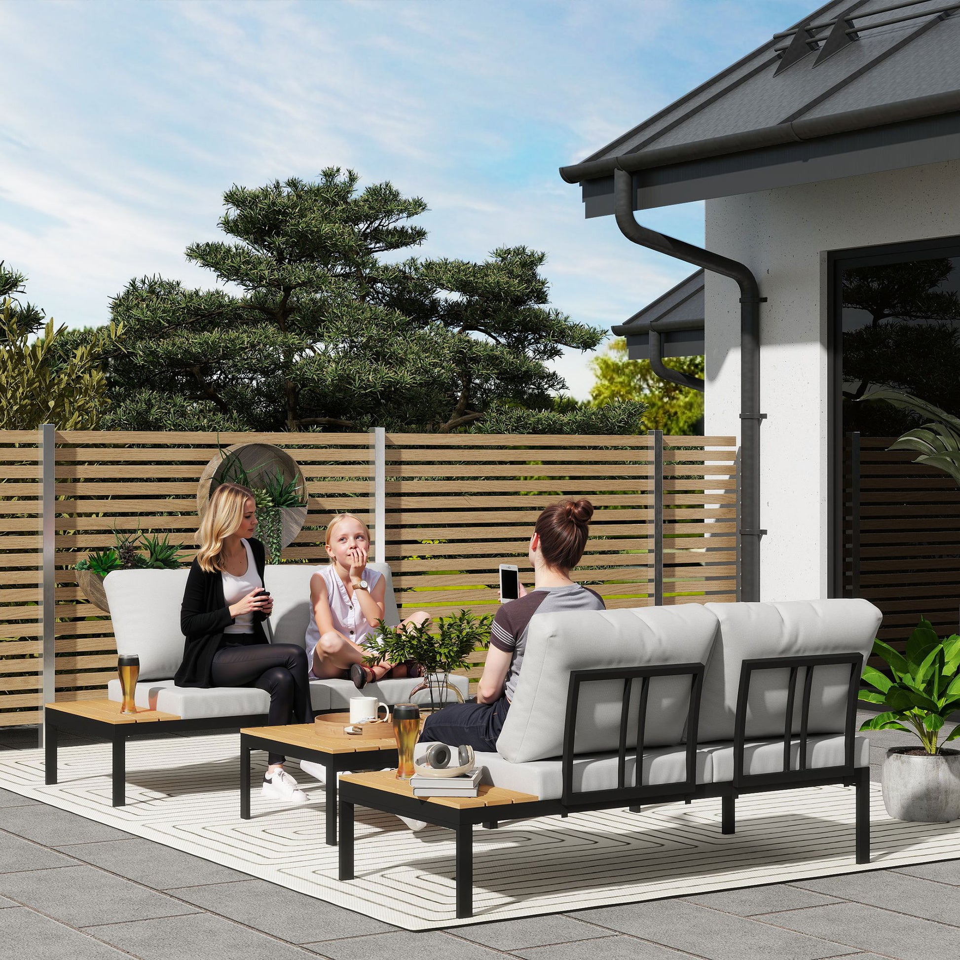 - Wood-plastic slatted tabletops prevent water accumulation, ensuring longevity