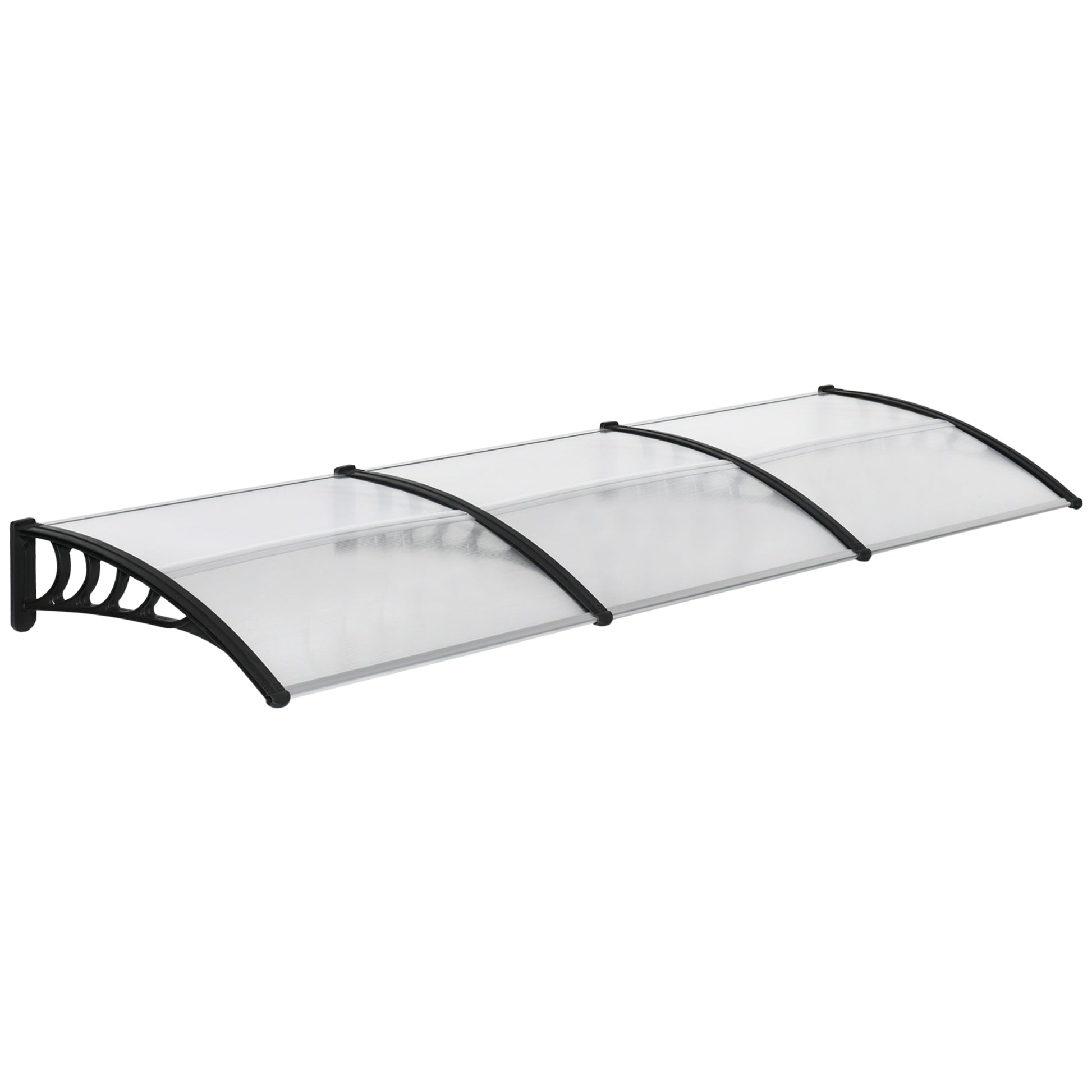 Keep the elements away from your doors and windows, all year long with this Outsunny three-panel double awning. Curved shape covers a larger area, whilst preventing any build-up on the end half. The aluminium frame is strong so it holds on place; it can be easily mounted on the wall with all required accessories included in the package. Each panel features a UV-resistant coating for protection against damaging rays - whether it's sunny or rainy.