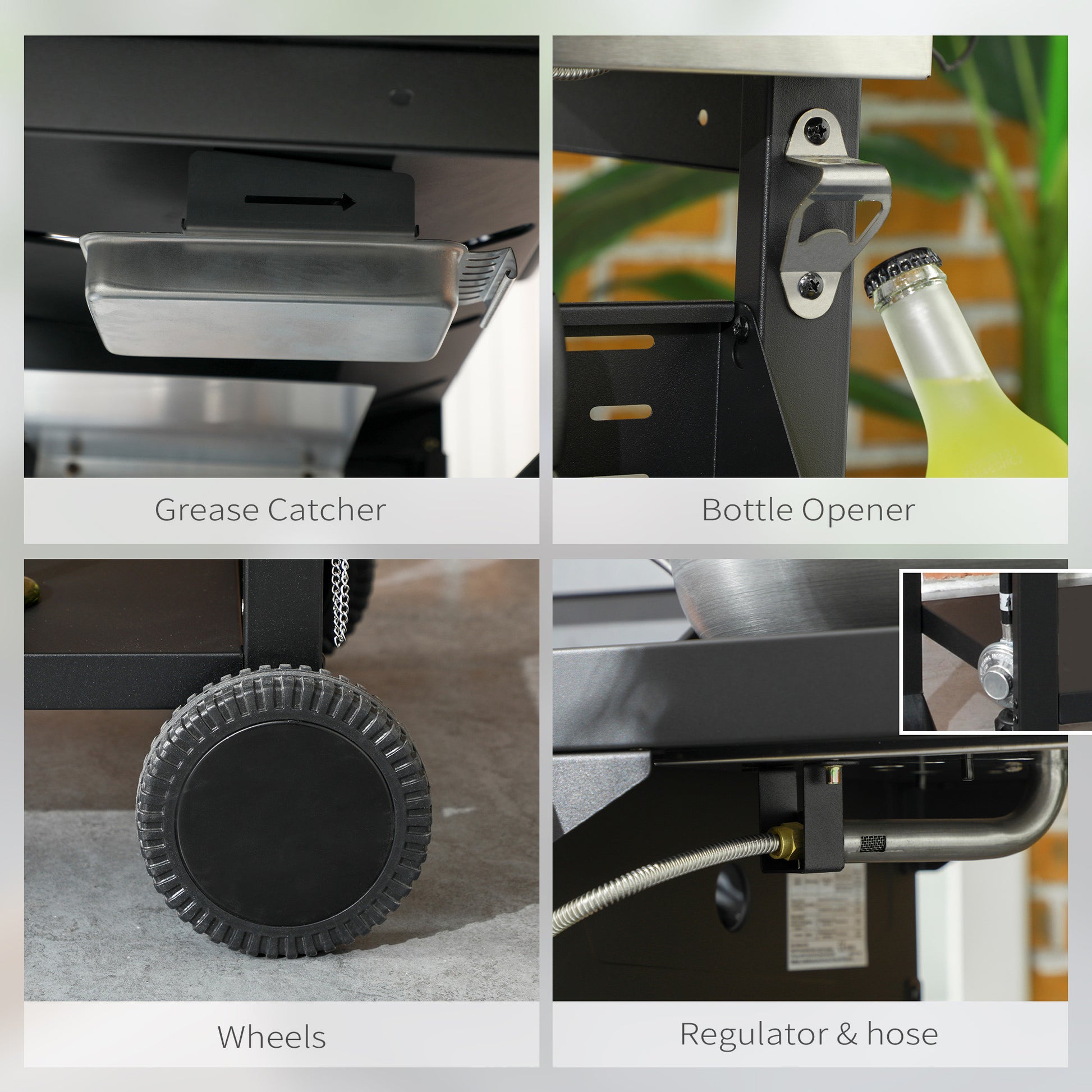 For an easy cookout at home, check out Outsunny's outdoor gas grill. Get some friends together and enjoy excellent food from your own personal BBQ. It features five independent burners with piezo ignition for separate operation. With a large grilling area, you can hold a 6-12 people party. Cleanup is hassle-free with the grease catcher and the built-in bottle opener adds convenience. Have freshly cooked food at your fingertips when you move your propane bbq grill freely.