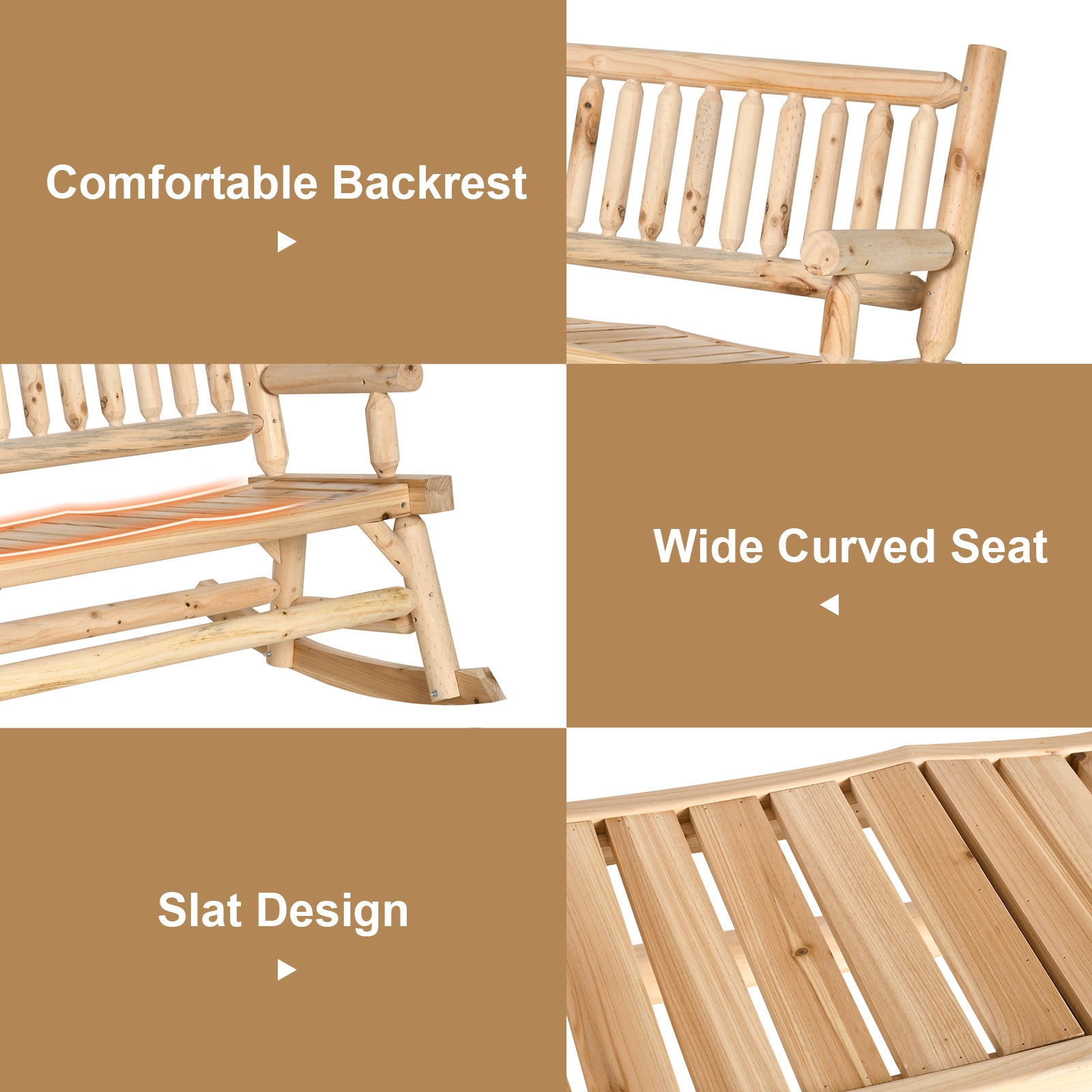 Outsunny Garden 2-Seater Rocking Bench Wood Frame Rough-Cut Log Loveseat Slatted High Back Rustic Style w/ Armrests Garden Outdoor Furniture, Natural