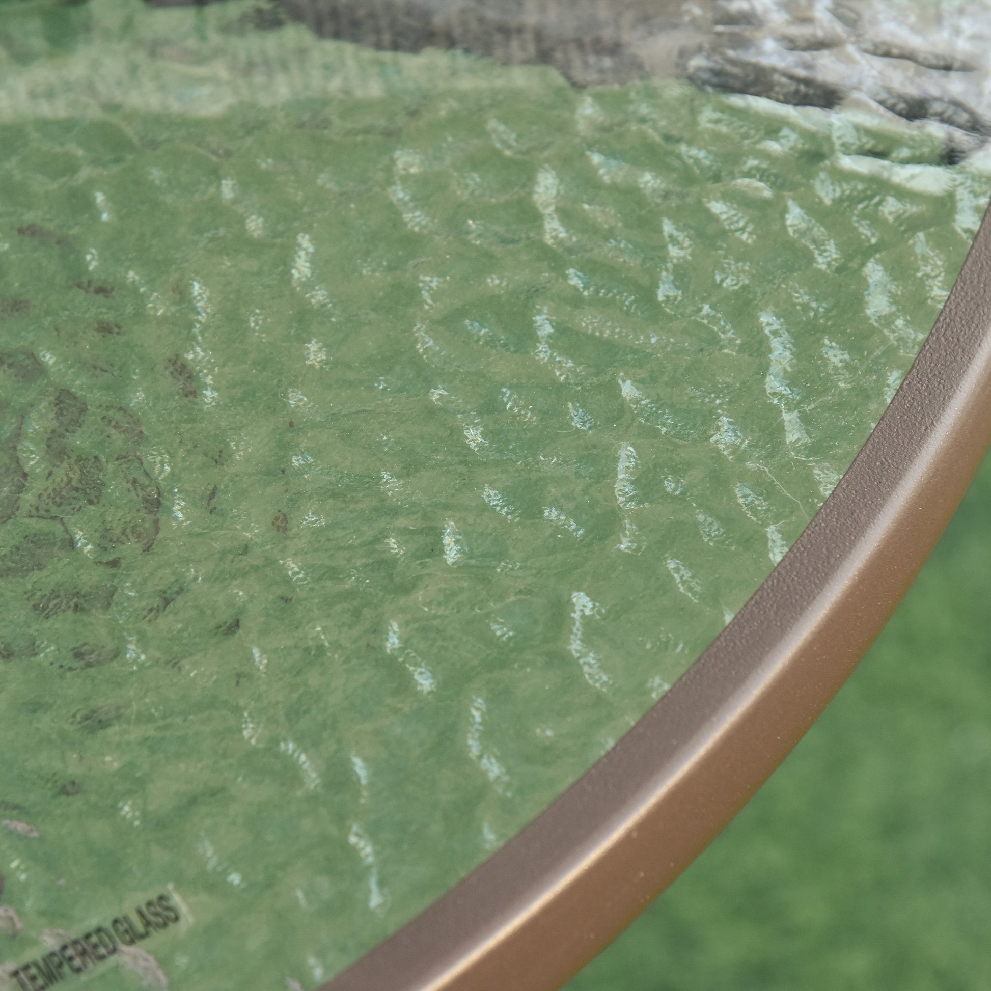 - The table has a black metal rim to protect the edge