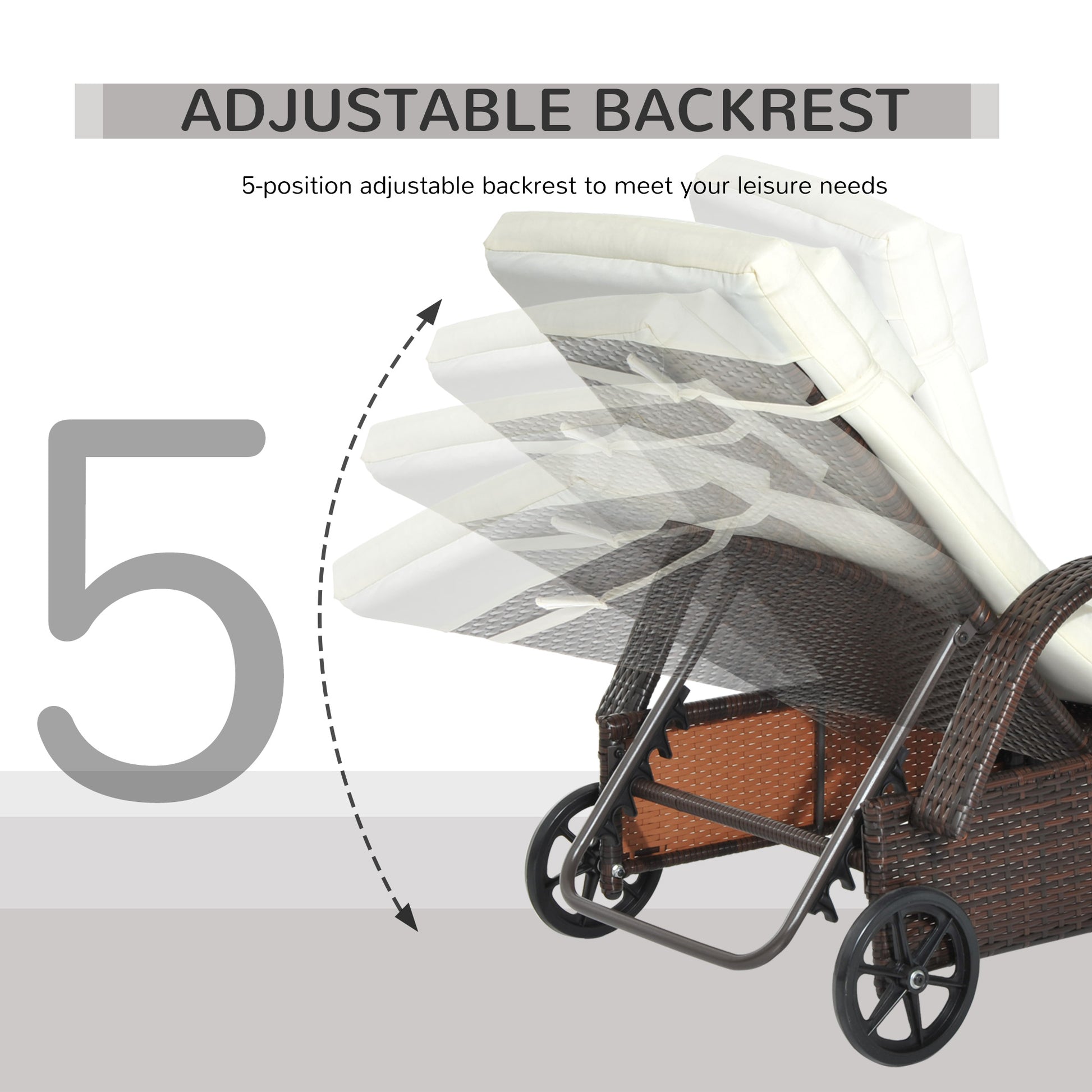 Soak up the sun with this Rattan Lounger from Outsunny. Made from weather-resistant PE wicker, with a strong steel frame underneath, the base is extremely sturdy and will provide you with many years of relaxation outside. On the top there is a thick foam cushion seat with a removable headrest for comfort and the back can be adjusted five different levels to suit your preferences. It is finished with two wheels to you can move it easily, whenever you wish.