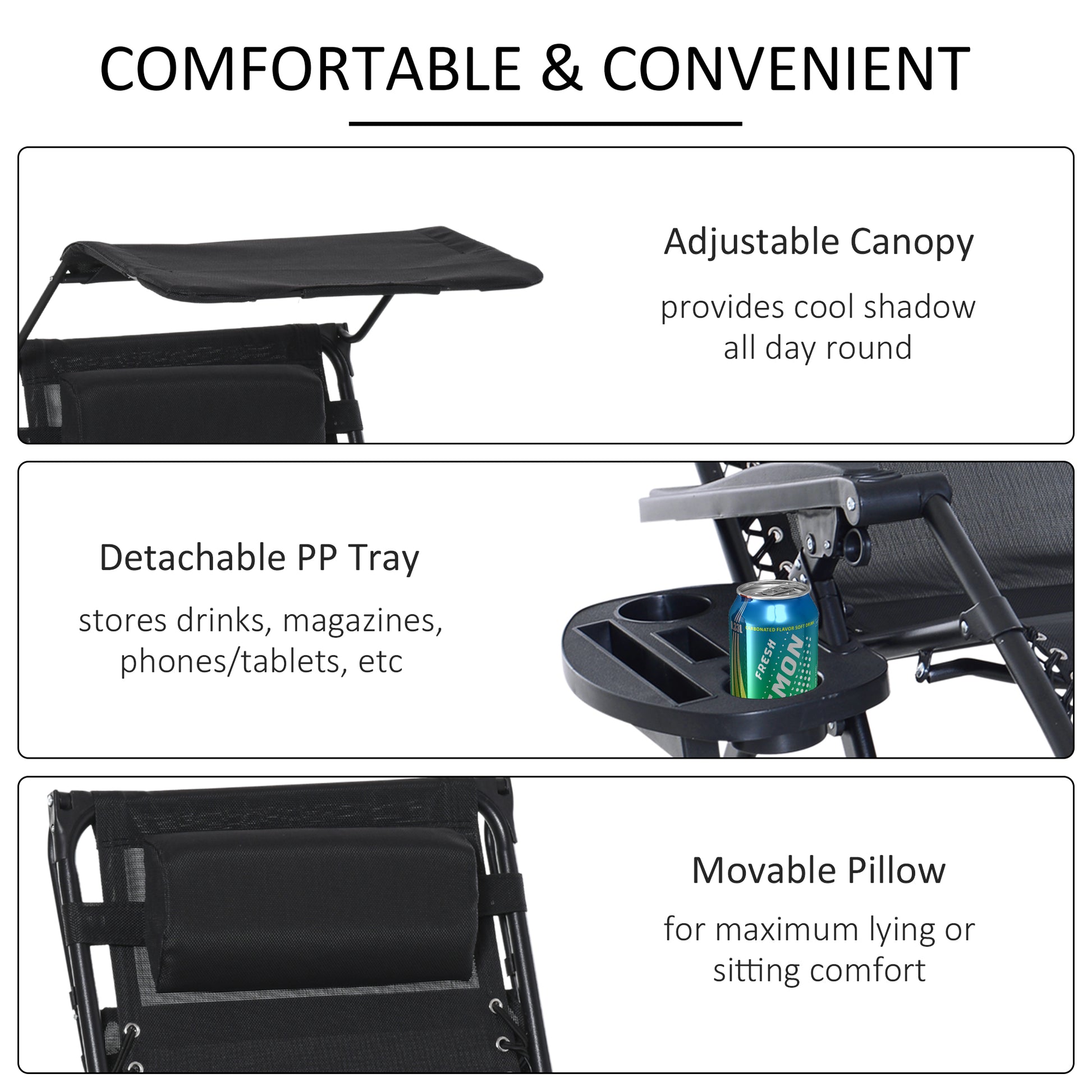 This rocking sun lounge chair from Outsunny is the perfect gateway to total relaxation in the sun. The powder-coated steel frame forms a tough structure, where the seat is attached to the base for a floating zero-gravity feel. The back freely adjusts between a 10°-35° angle so you can lie back to a position you like. The fabric seat and padded headrest make it comfortable, finished with a handy side tray and top canopy to shield you safely.