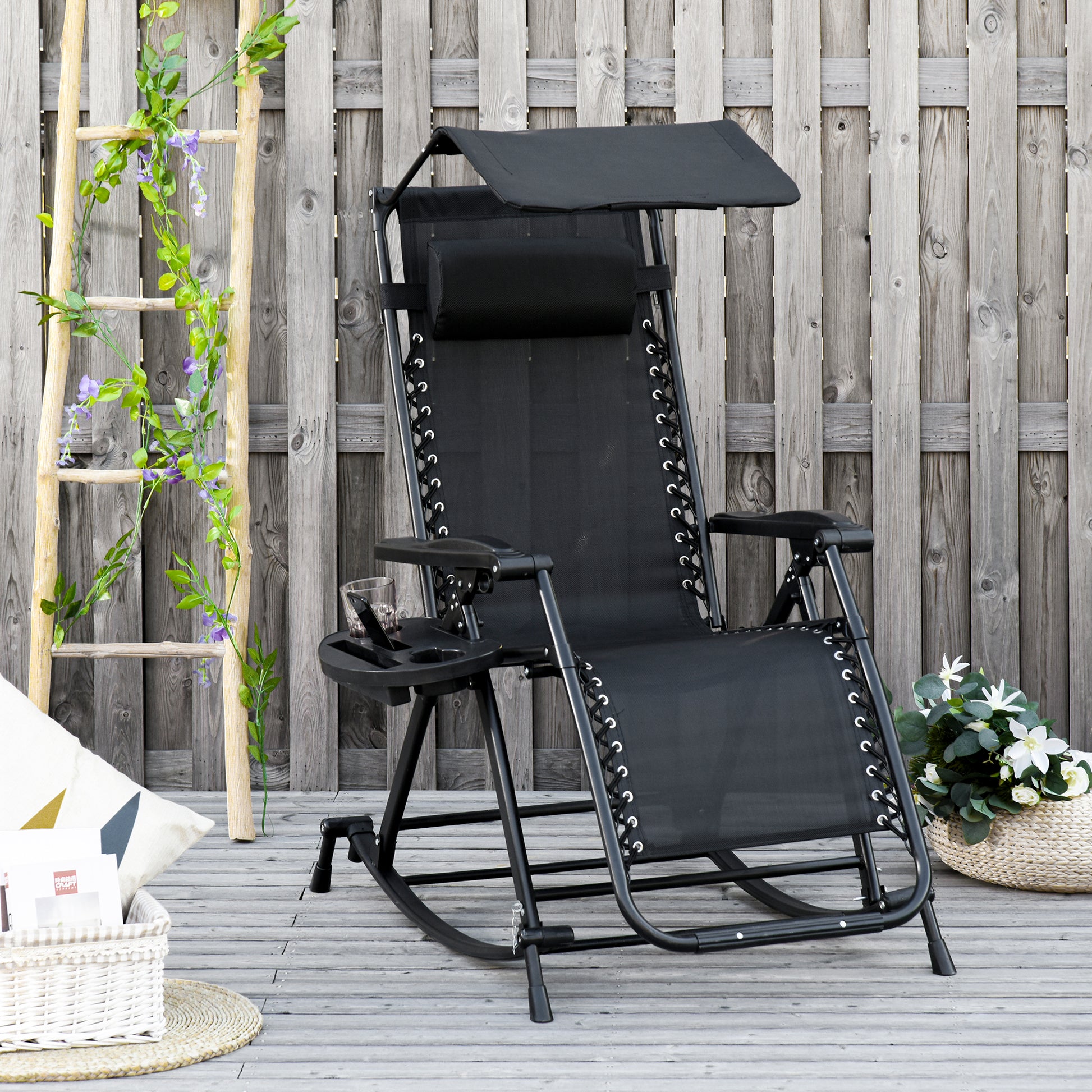 Outsunny Garden Rocking Chair Folding Recliner Outdoor Adjustable Sun Lounger Rocker Zero-Gravity Seat with Headrest Side Holder Patio Deck - Black