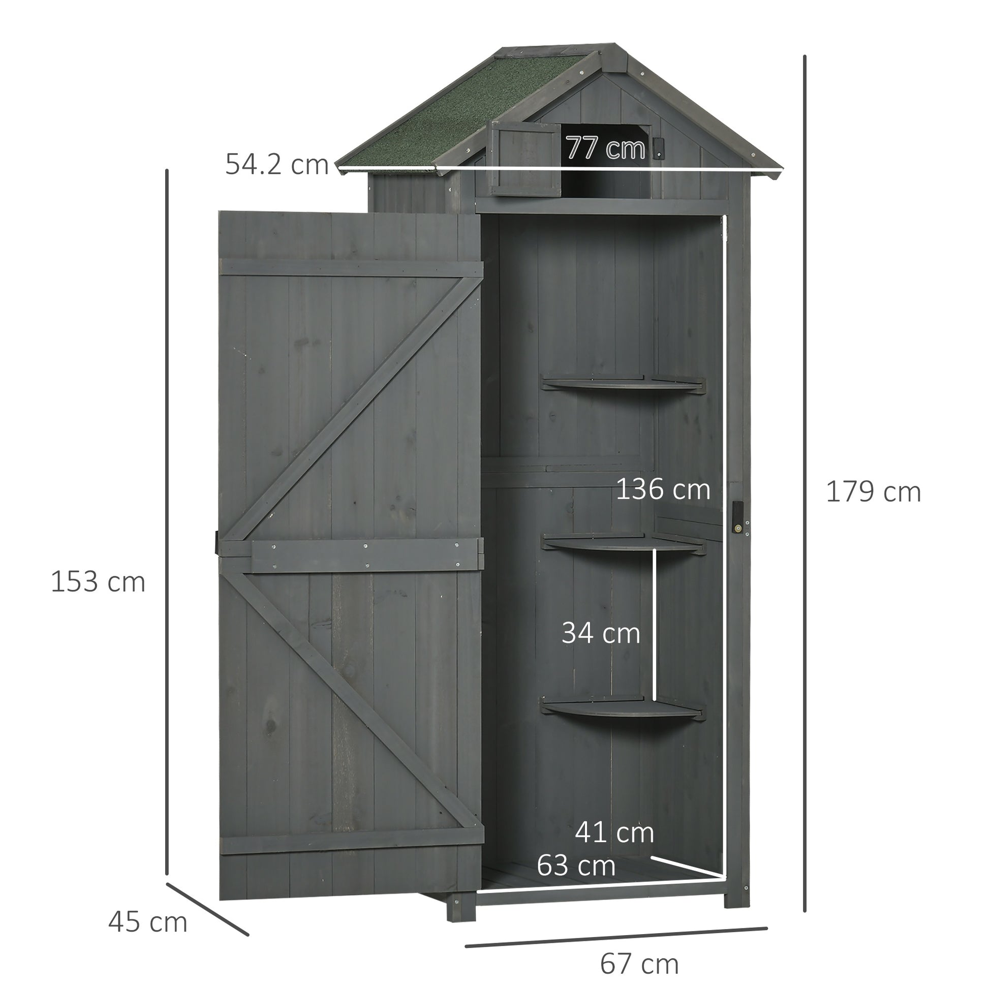 Outsunny Garden Shed Vertical Utility 3 Shelves Shed Wood Outdoor Garden Tool Storage Unit Storage Cabinet, 77 x 54.2 x 179cm - Grey
