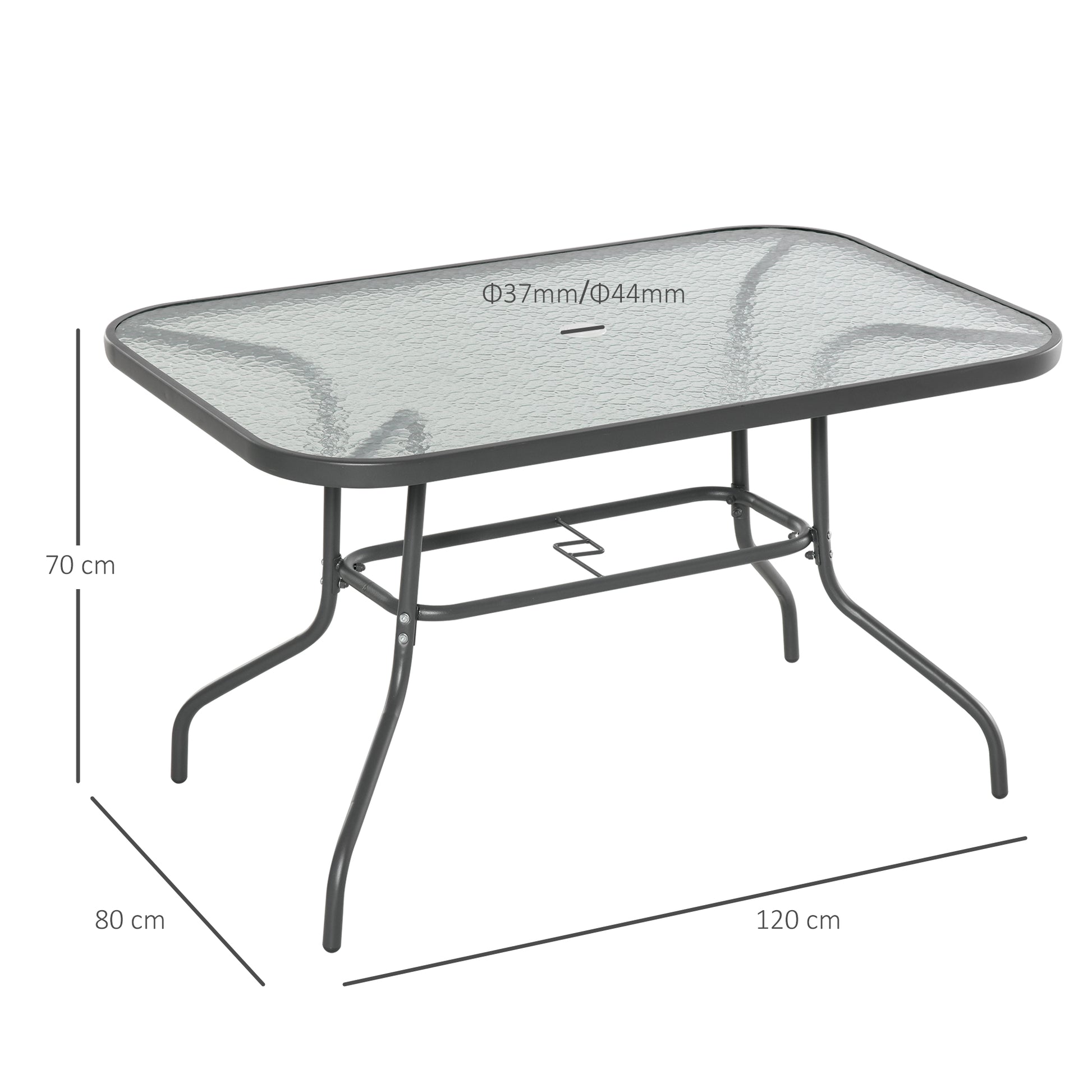 - Φ37mm / Φ44mm parasol hole in the middle of tabletop, keeps a sun umbrella upright and in place for shade and protection from direct sunlight