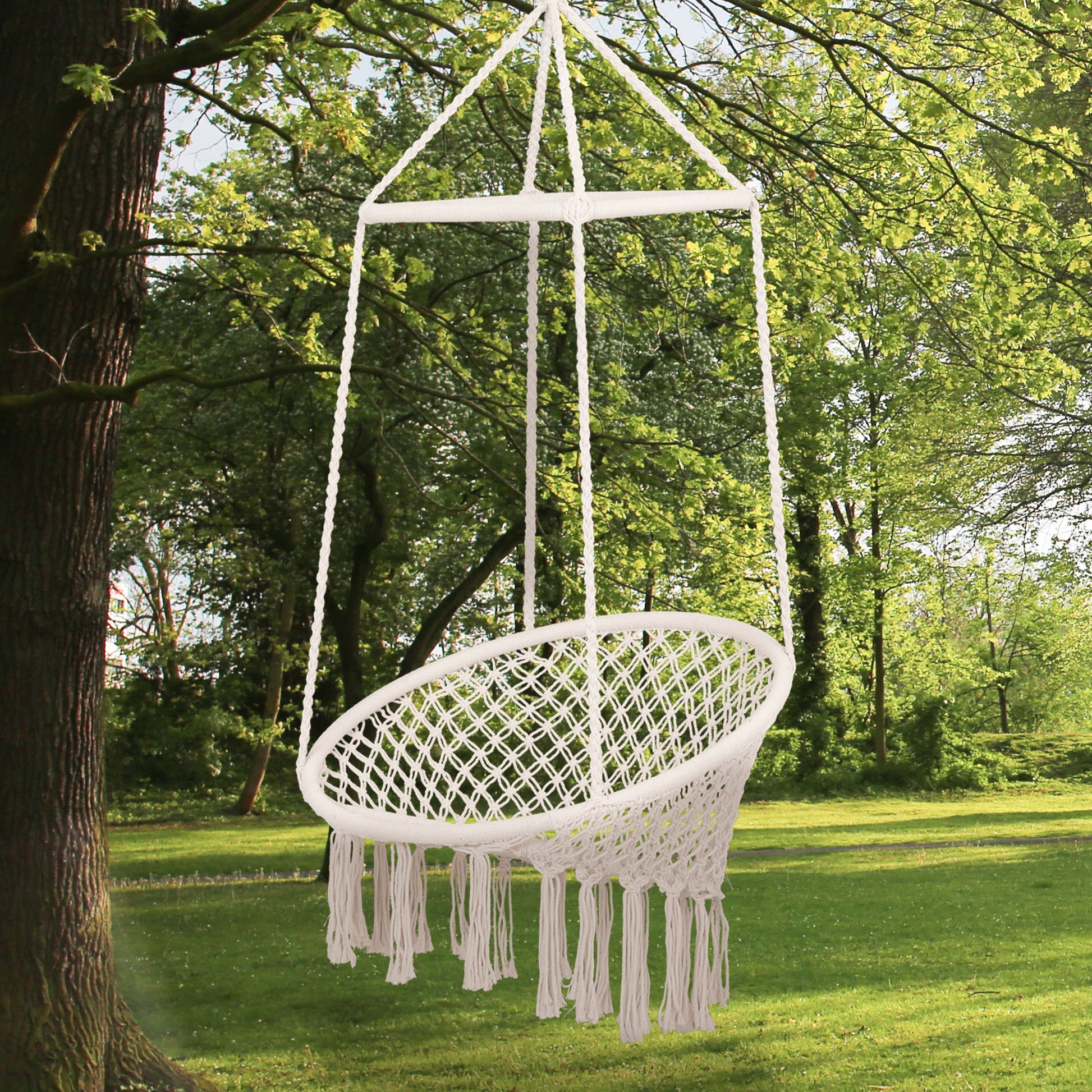 Outsunny Hammock Macrame Swing Chair Hanging Seat Rope Tassels Indoor Outdoor Garden Solid Knitted Woven Net Seat Deck Porch Yard Beige