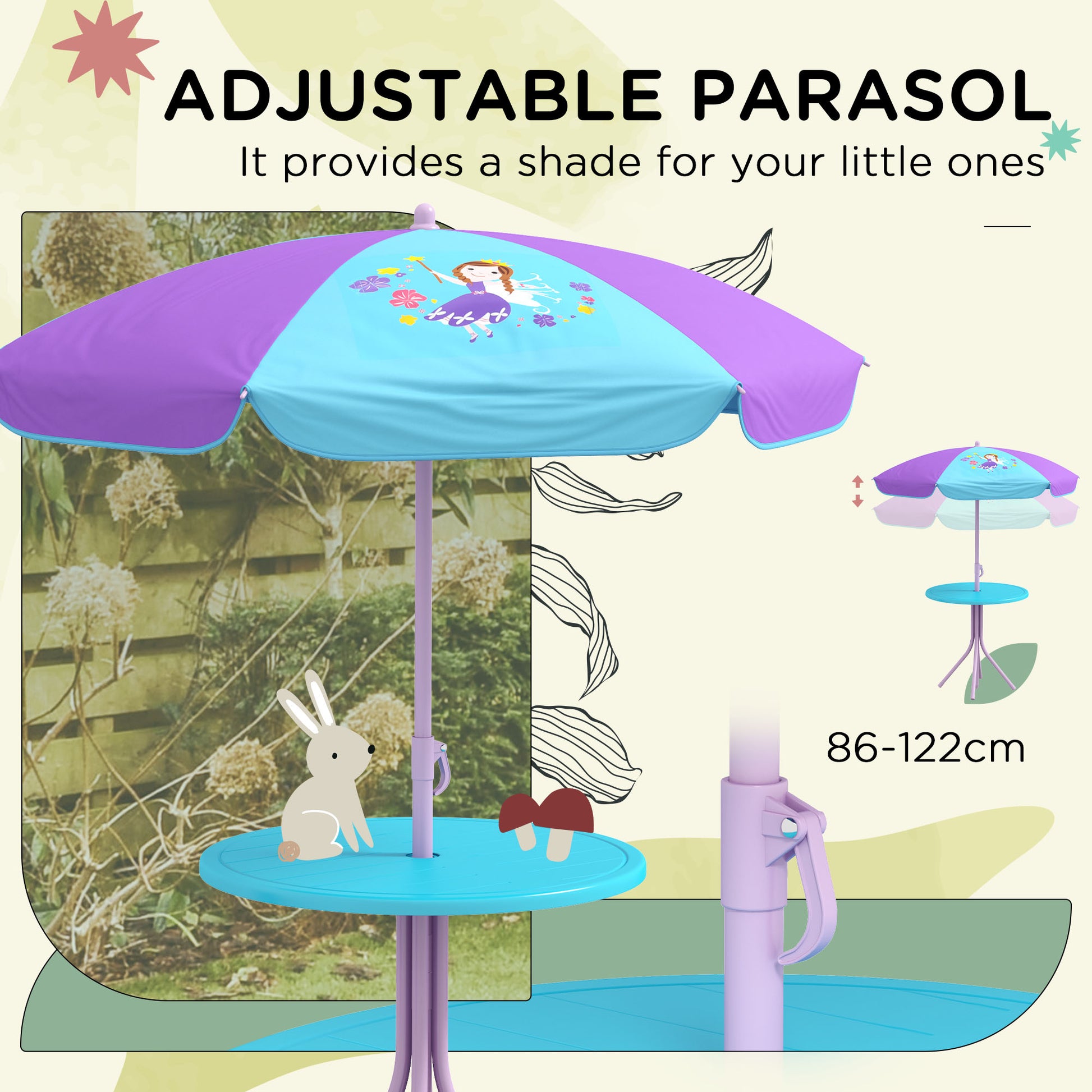 Outsunny Kids Picnic Table and Chair Set, Fairy Themed Outdoor Garden Furniture w/ Foldable Chairs, Adjustable Parasol