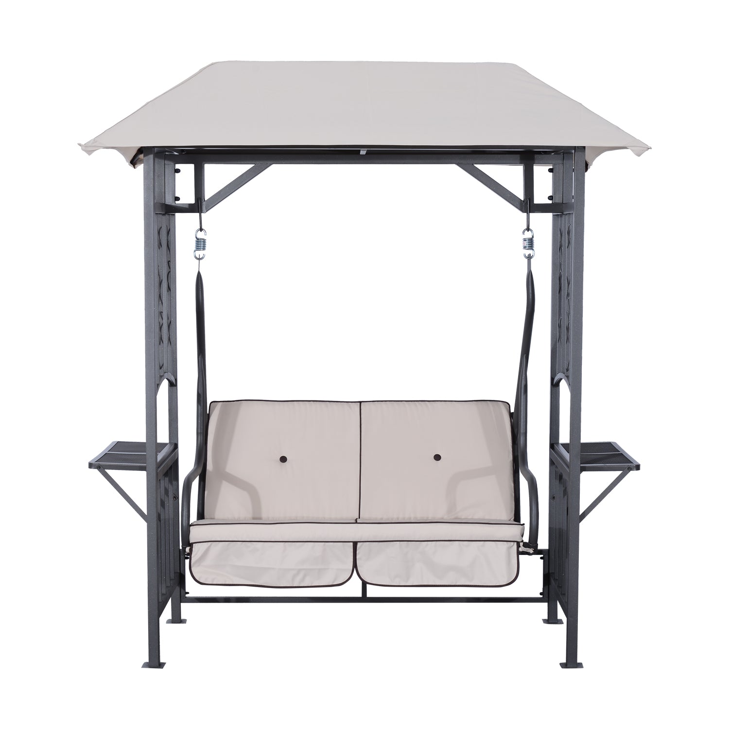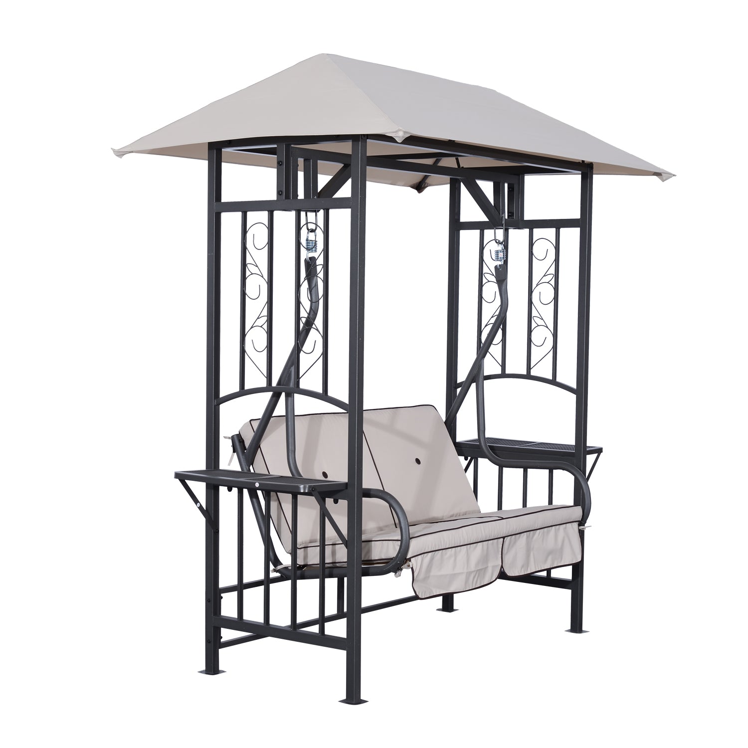 This Outsunny 2 seater swing chair is a great addition to any outdoor living space, design with a metal frame with a canopy the chairs hang from the frame to give you the swinging motion. It also features two side tables on either side to hold drinks and accessories. Made from a rust resistant metal frame for strength and stability, with a weight capacity of 180Kg. The canopy cover is made from polyester allowing for shade from sunlight and light rain. The seating has 8cm thick cushions for ultimate comfort. This is a great piece of furniture and will match any outdoor décor.