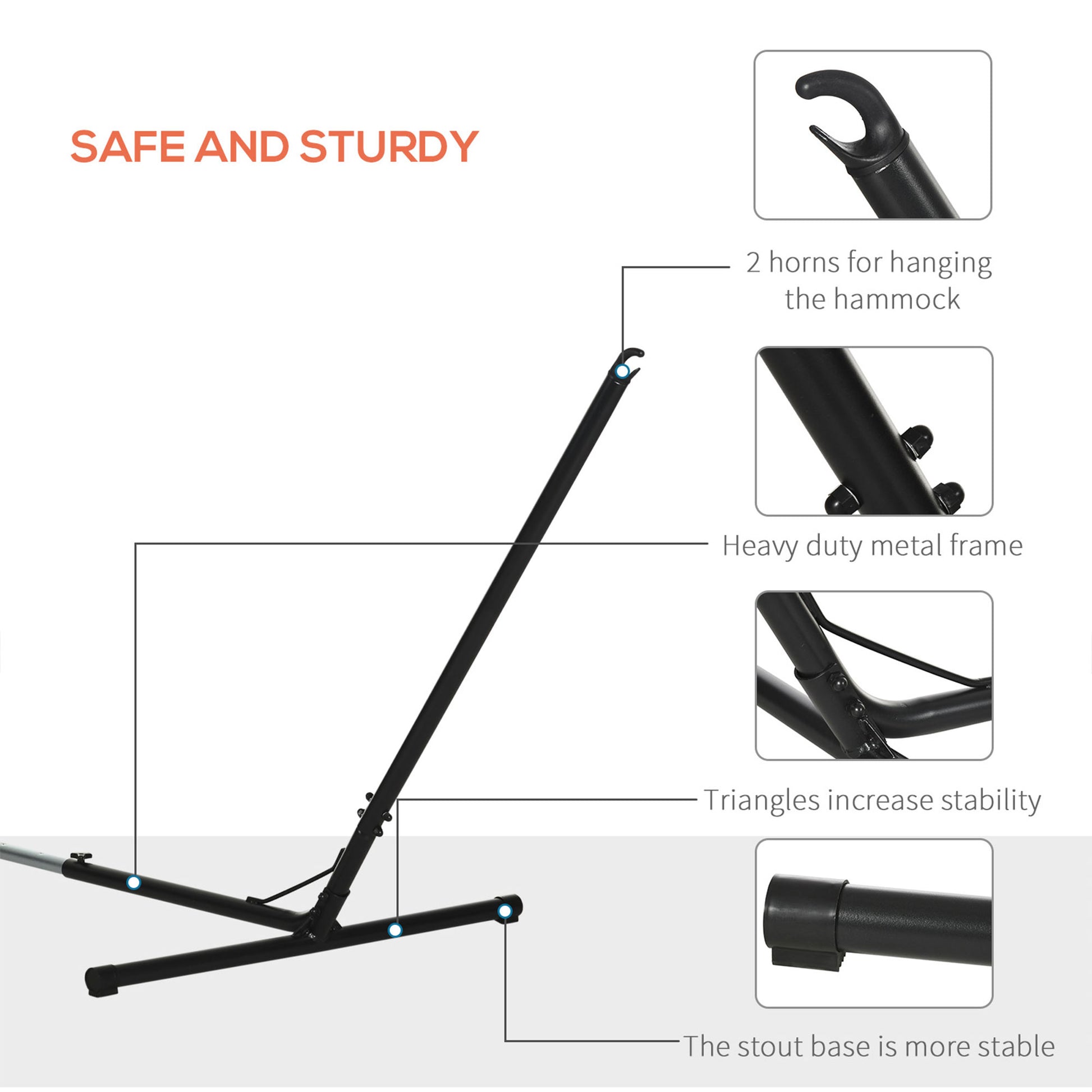 This Outsunny garden hammock is a great way to relax in the sun and enjoy your outdoor living space. Our portable hammock comes complete with a metal frame with adjustable bottom bars to keep it balanced and a comfortable cotton hammock bed. Double-person cotton bed is roomy, with pillow for more comfort. Our free standing hammock is a great item made for lounging all day long. You can take a comfortable nap on your porch, under a tree or by the seaside for hours of relaxation.