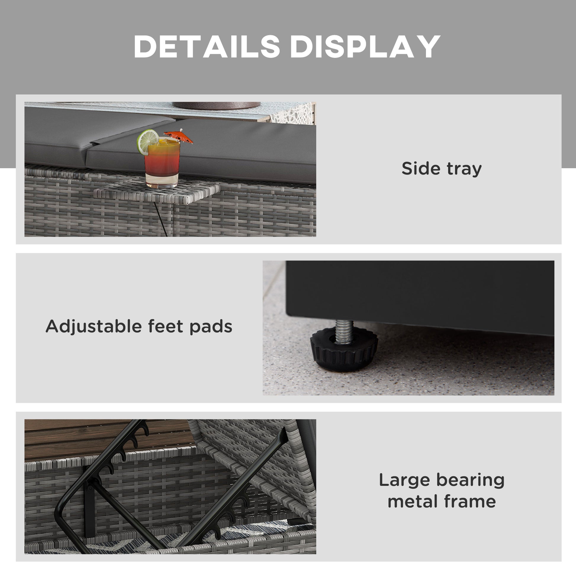 Outdoor Patio PE Rattan Sun Lounger With Cushion, 5-Level Reclining Wicker Rattan With Tea Tray, for Poolside, Patio, Deck - Grey