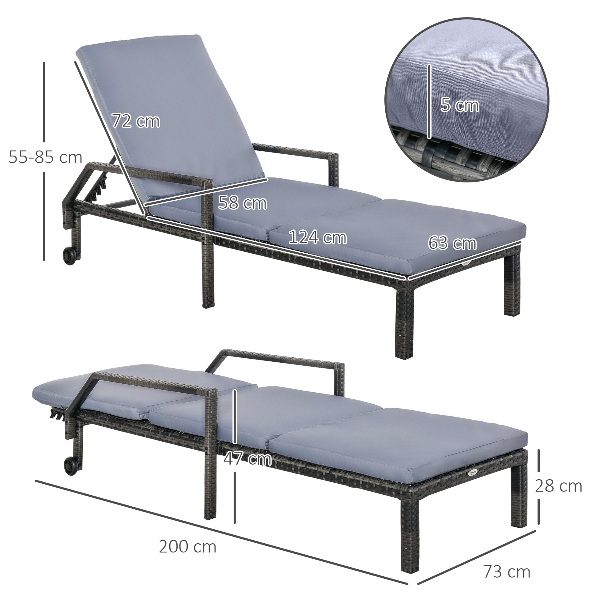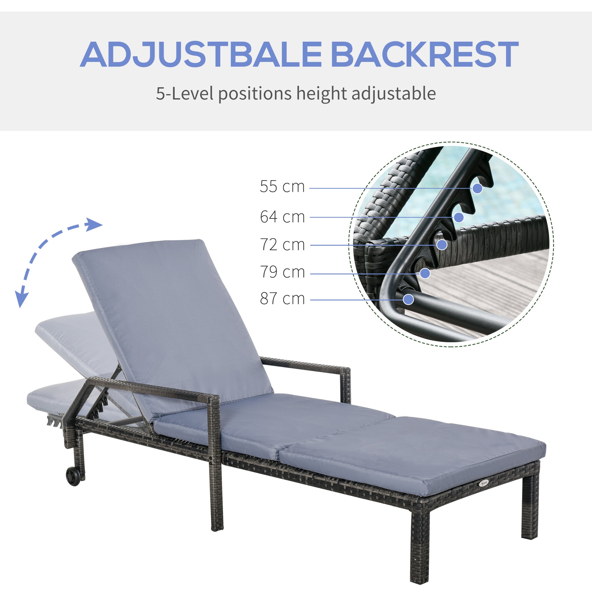 This outdoor rattan sun lounger from Outsunny is stylish and can fit with any backyard decor. Constructed by all hand woven PE rattan wicker and metal frame for durability. 5-level adjustable backrest, which can match your body provide relaxing and sleeping modes. With flexible wheels on both sides, the chaise chair can be easily moved from place to place as you like. Ensuring you will feel relaxed while sunbathing with our outdoor furniture.