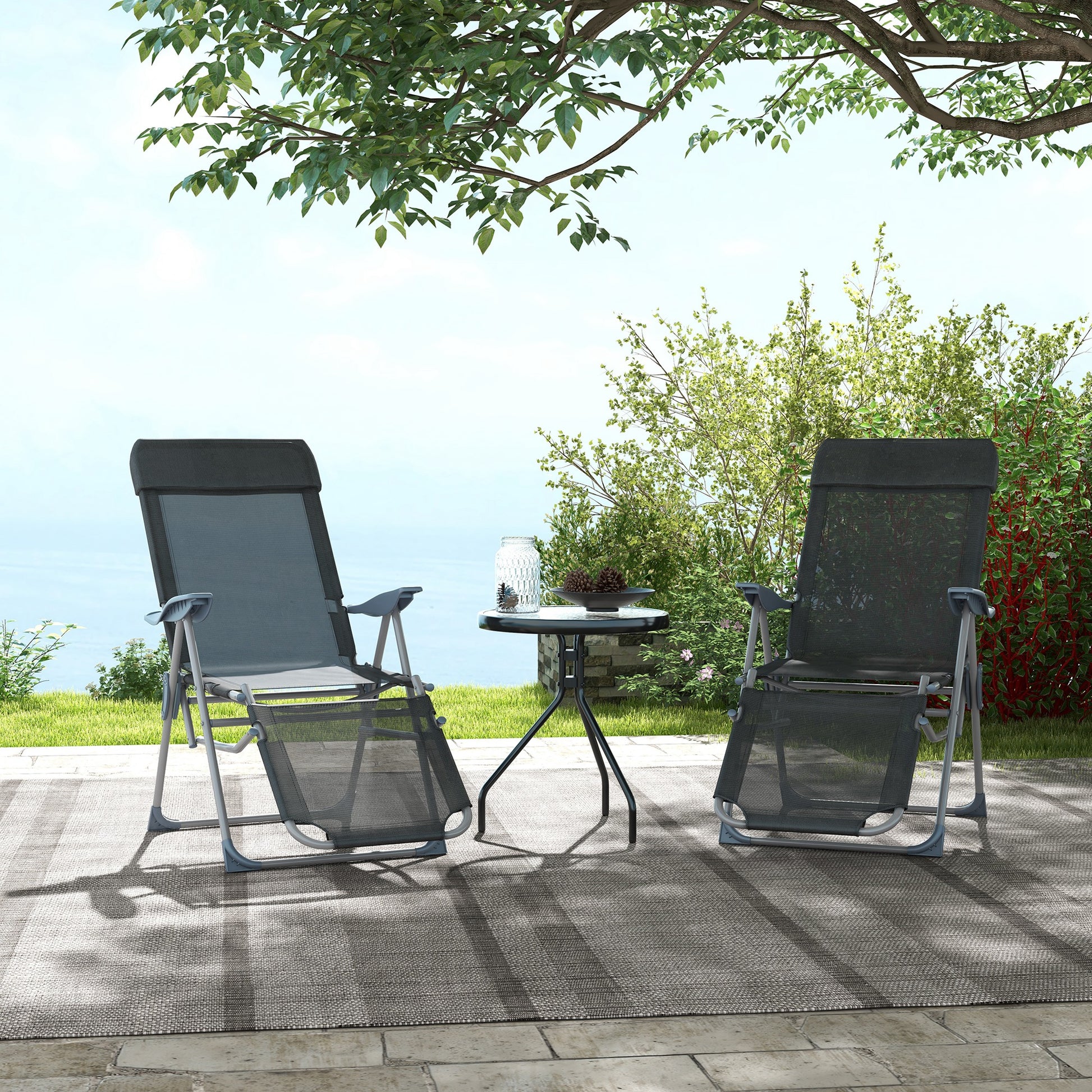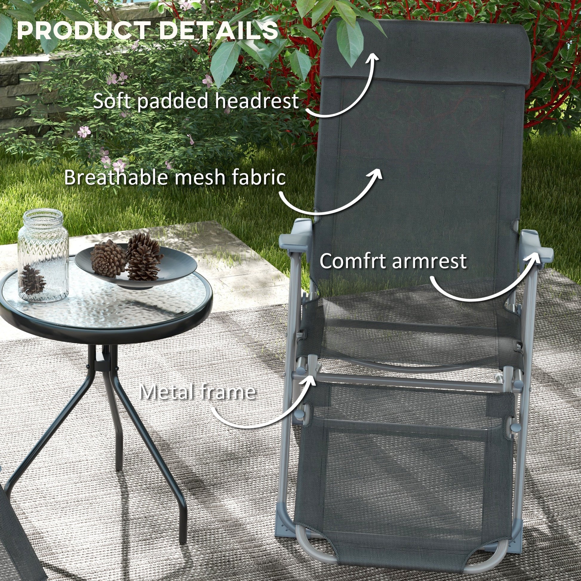 Outdoor Reclining Garden Chairs Set Of 2 With Adjustable Footrest, Recliner Garden Chairs with 5-level Adjustable Backrest, Headrest, Black