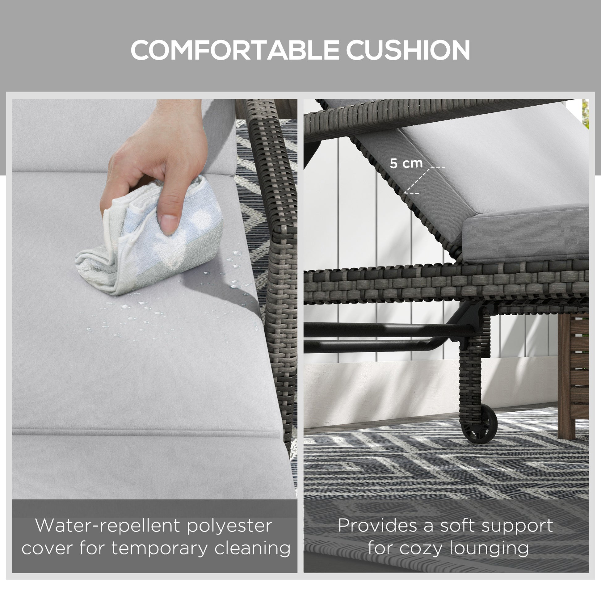 This Outsunny sun lounger is great for all-day relaxing. With a longline padded cushion and five-position back, this is a comfortable piece that can be customised to your choice. A metal frame for a strong core, wrapped in plastic wicker - protecting the metal whilst creating a stylish garden look. Complete with wheels to move around easily.