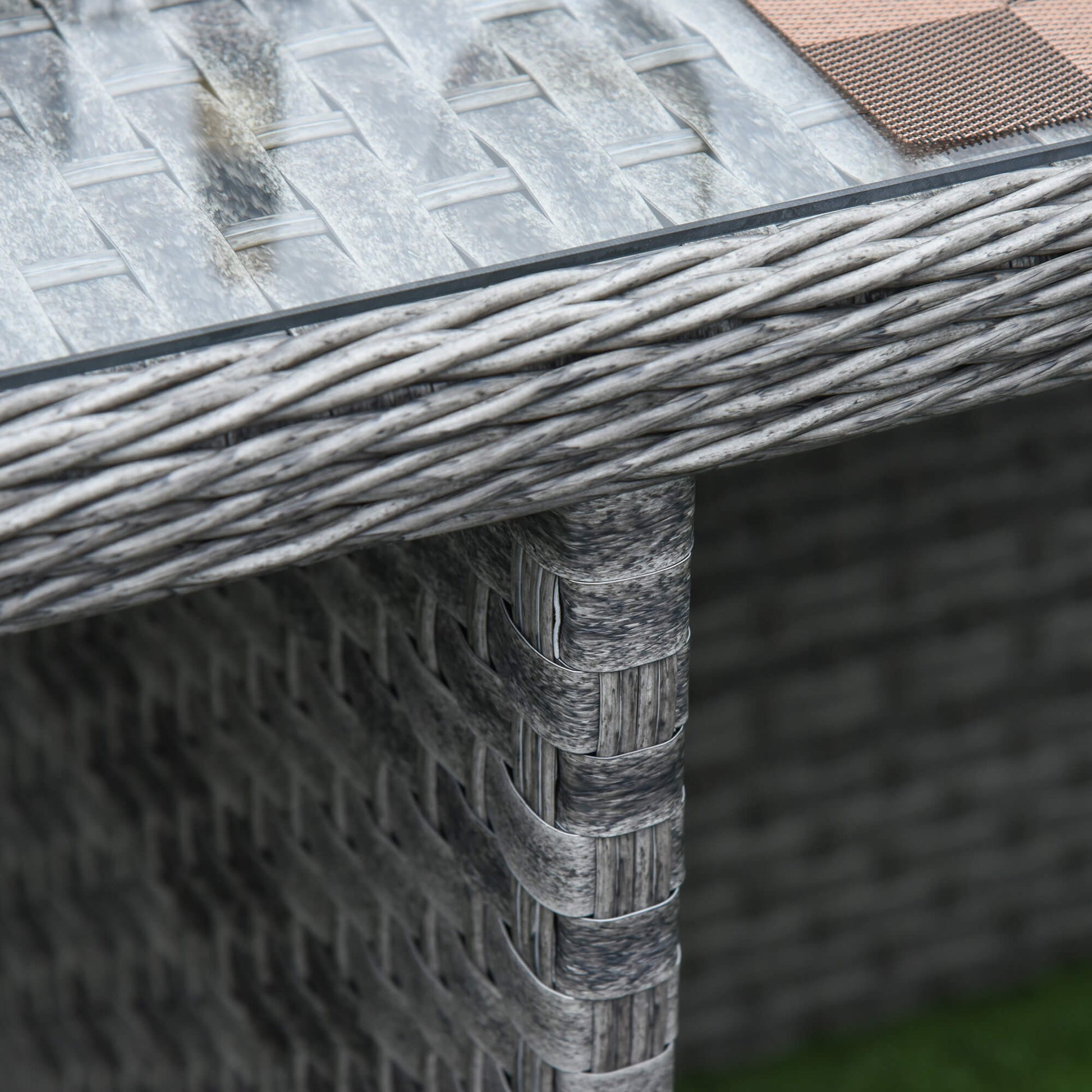 The nine-piece rattan garden dining set from Outsunny creates an inviting setting, ideal for garden and other outdoor areas. Using rust-resistant metal for a solid frame, PE wicker of the rattan cube dining sets is woven around for extra durability and weather resistance. The tempered glass table top of the corner rattan dining set is super easy to clean and adds a sophisticated look, with a handy parasol hole to keep you protected against the sun. Family get-togethers never looked so stylish.