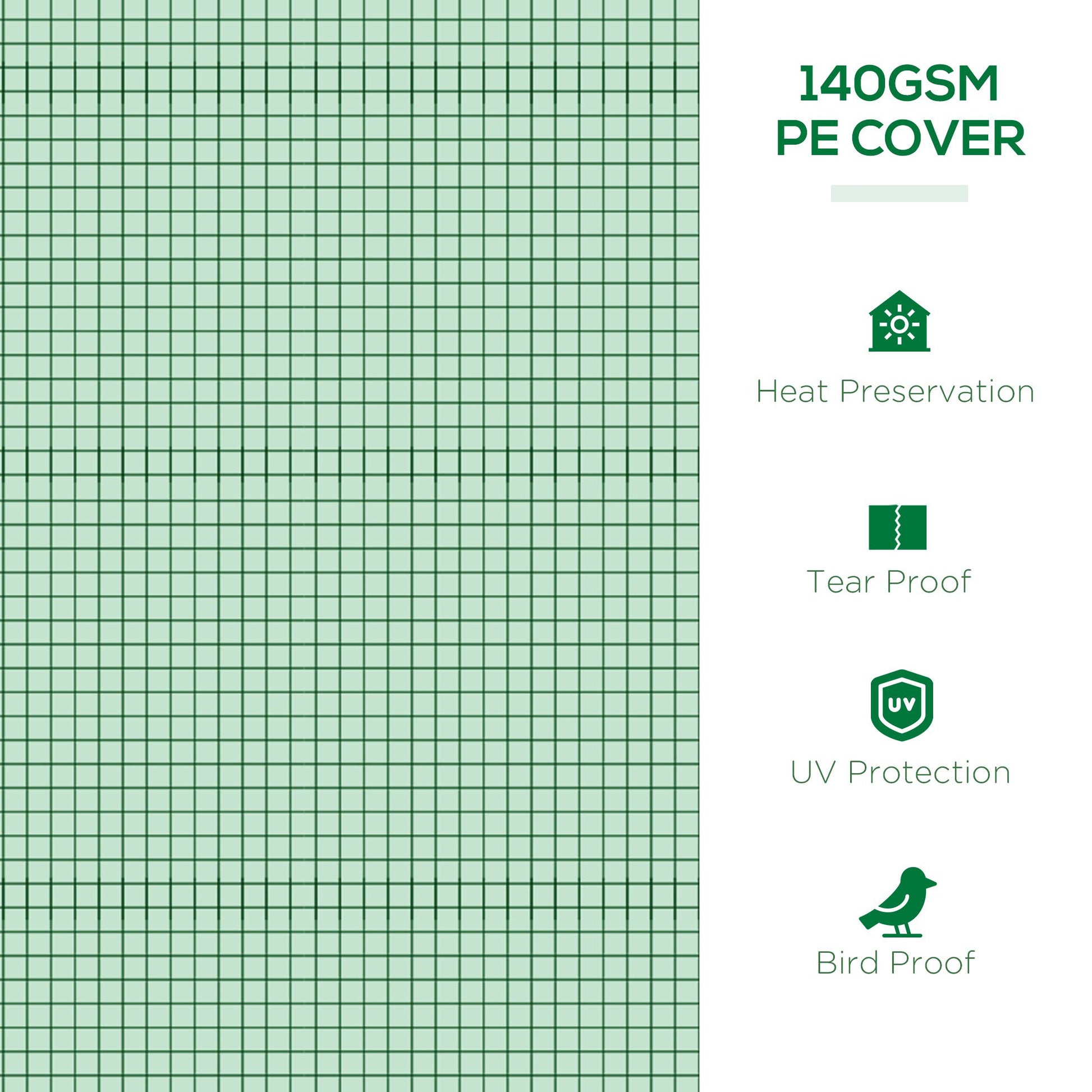 - Reinforced plastic cover, with 10cm extended edge to weigh down/dig into soil