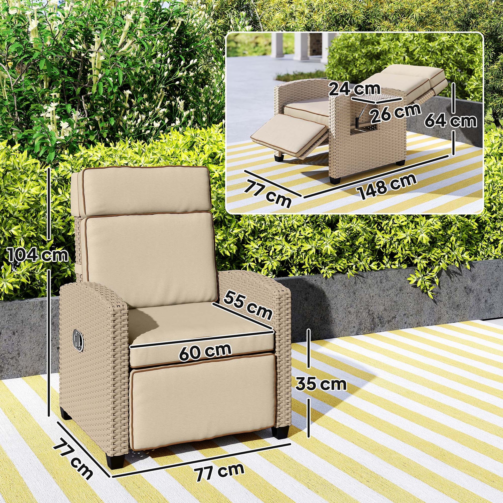 Forever on-trend rattan style, at an angle you want to relax - thanks to this Outsunny rattan recliner chair. The 145° adjustable back goes to a minimum height of 64 cm from the ground, paired with the footrest for full body relaxation. The wide-seat outdoor lounge chair features a long thick padding cushion for plenty of comfort. Use the flip-up side tray to keep items right next to you - no moving from this recliner garden chair once you've sat down.