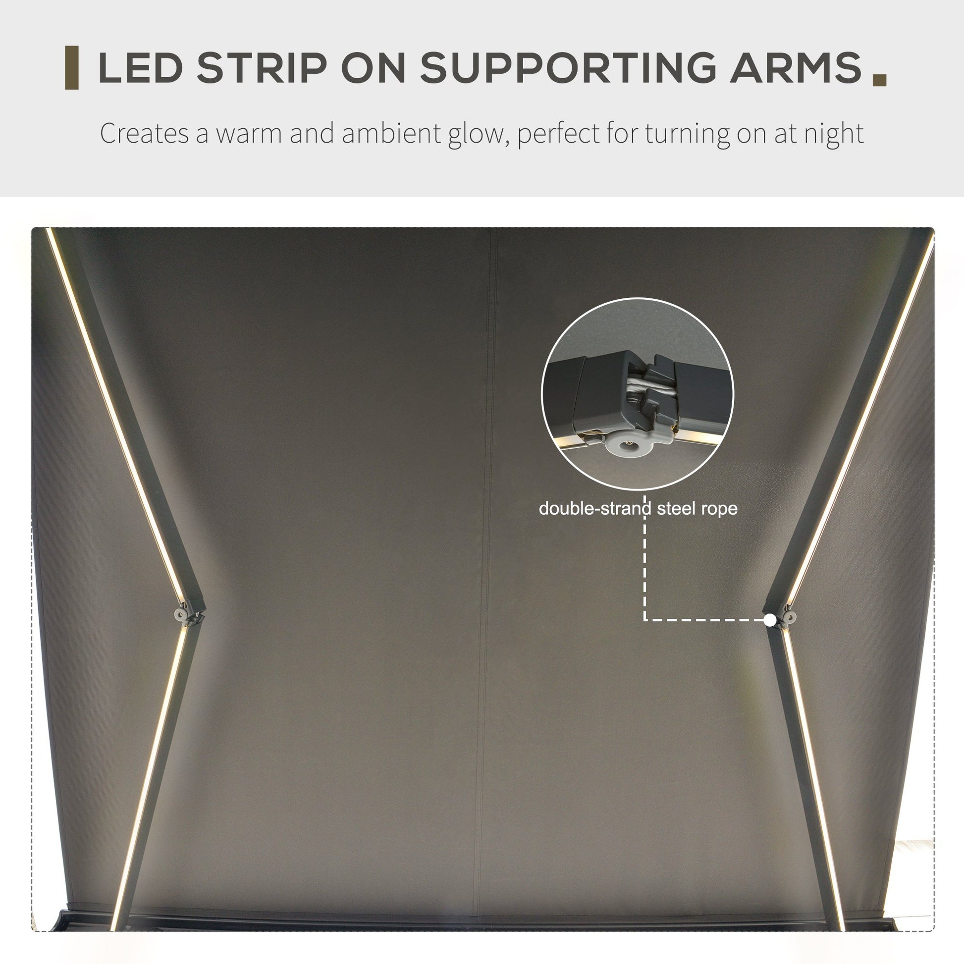 Provide cover for yourself outdoors in an instant with this electronic cassette awning from Outsunny. The frame is made from a blend of aluminium and steel, reinforcing its strength and ensuring it is strong and reliable for use outdoors in all weather. Using 280g/m², the canopy features a PVC coating on the top, helping to protect you from UV and sun glare without fading the colour – allowing it to be used all year-round, with an LED strip on the supporting arms to provide a soft and beautiful glow at night. Handle for manual operation included. Fixes to cement walls, remote control included.