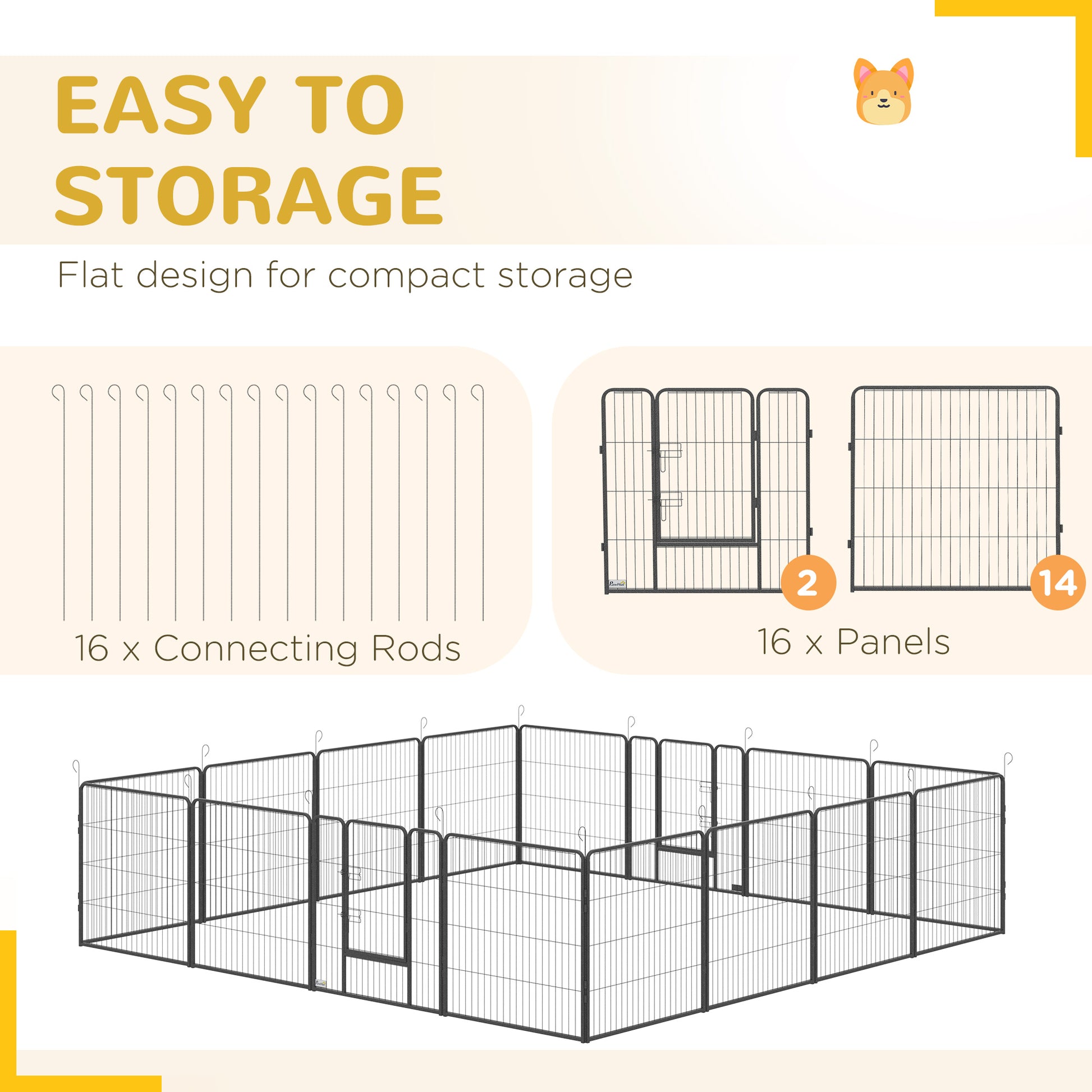 With this PawHut pet pen, pets have a safe space to be themselves, whilst giving you peace of mind. With 16 panels, it's flexible and spacious, providing lots of room to roam, play and relax – pets won't feel boxed in. Features ground stakes that go into the ground for stability, you'll set this playpen into different shapes to fit your layout, whether it's inside or outside. For pets, it's freedom and security, and for you, it's knowing they're safe and sound, with lots of space to enjoy.