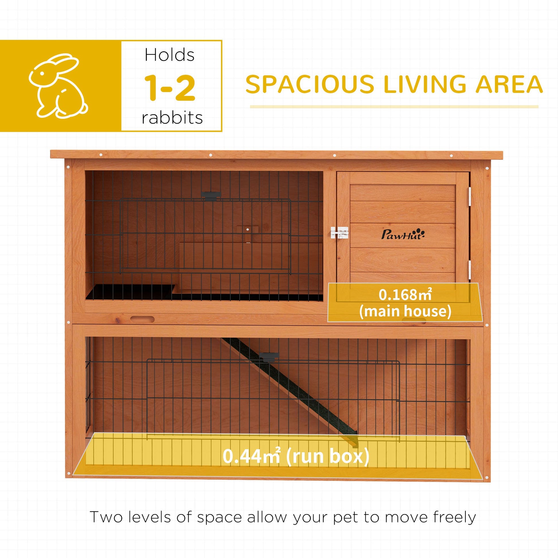Introducing spacious living for small pets, this PawHut rabbit hutch boats generous room in the main house and run area. Your pets will enjoy freedom on the upper and lower tiers, creating a comfortable surrounding for hopping, playing and exercising. Asphalt roof with anti-corrosion treatment, it's suitable for outdoor use. Create a happy home, where pets can burn energy, indulge in playful activities and relax – a snug and thriving living space.