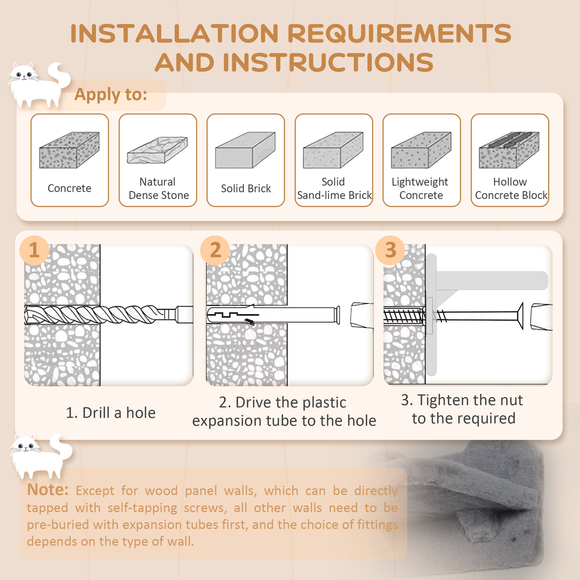 - Note: All walls must be pre-drilled with expansion tubes, except for plant walls, were self-tapping screws can be used directly into the wall