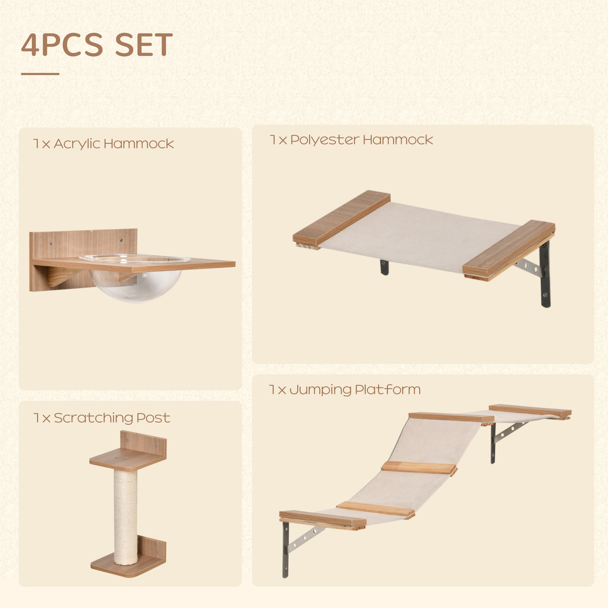 A place for them to jump, their own spots others can not get to. This PawHut four-piece on-wall set is a must for all kittens and cats. Set comes with: a clear-bowl hammock, small and long platform and scratching post: each piece with the metal can be attached to the wall - freestanding so you can attach them anywhere you want. Sisal rope wrapped on the post gives cats a place to sharpen their claws safely. It's time to curb their curiosity, all day - every day.