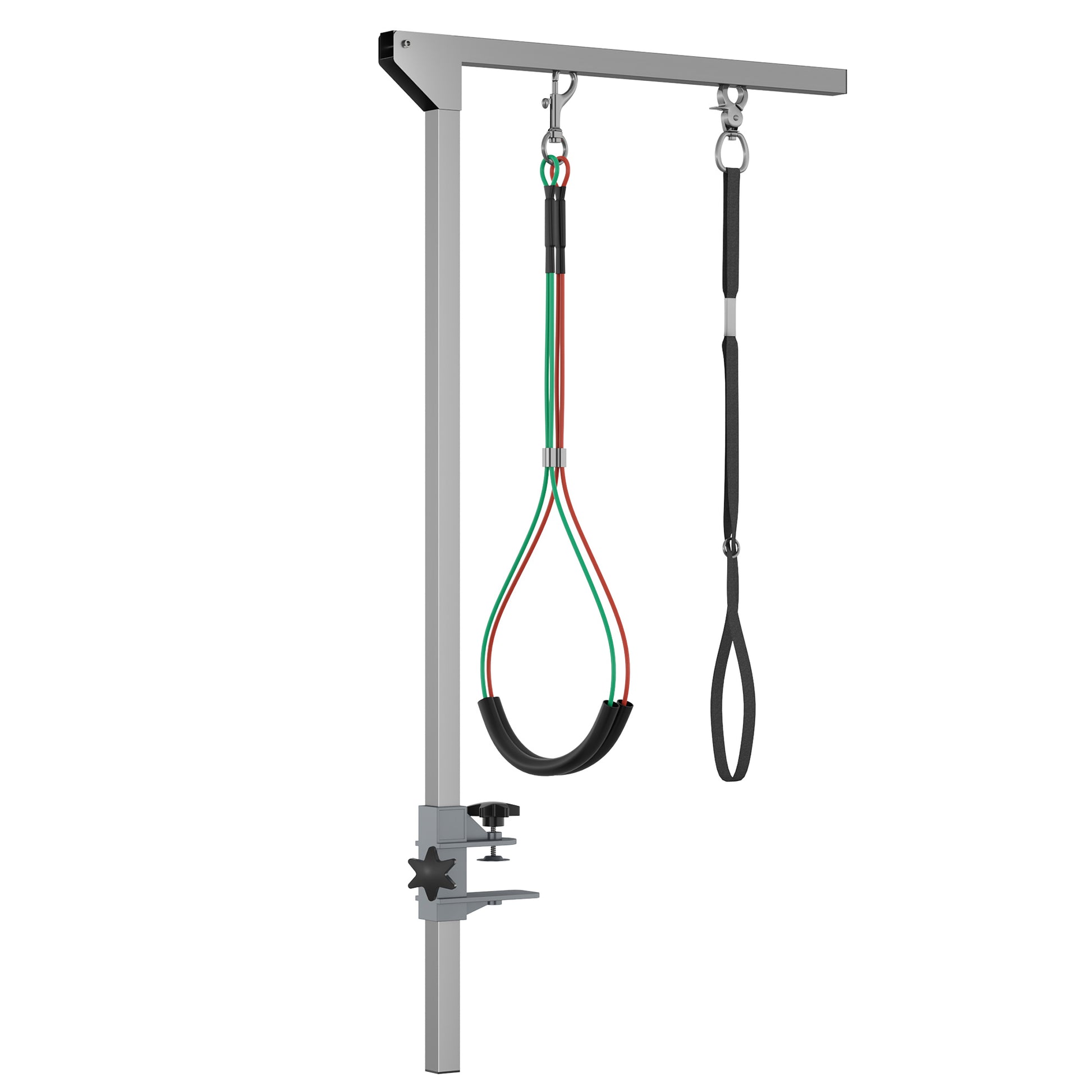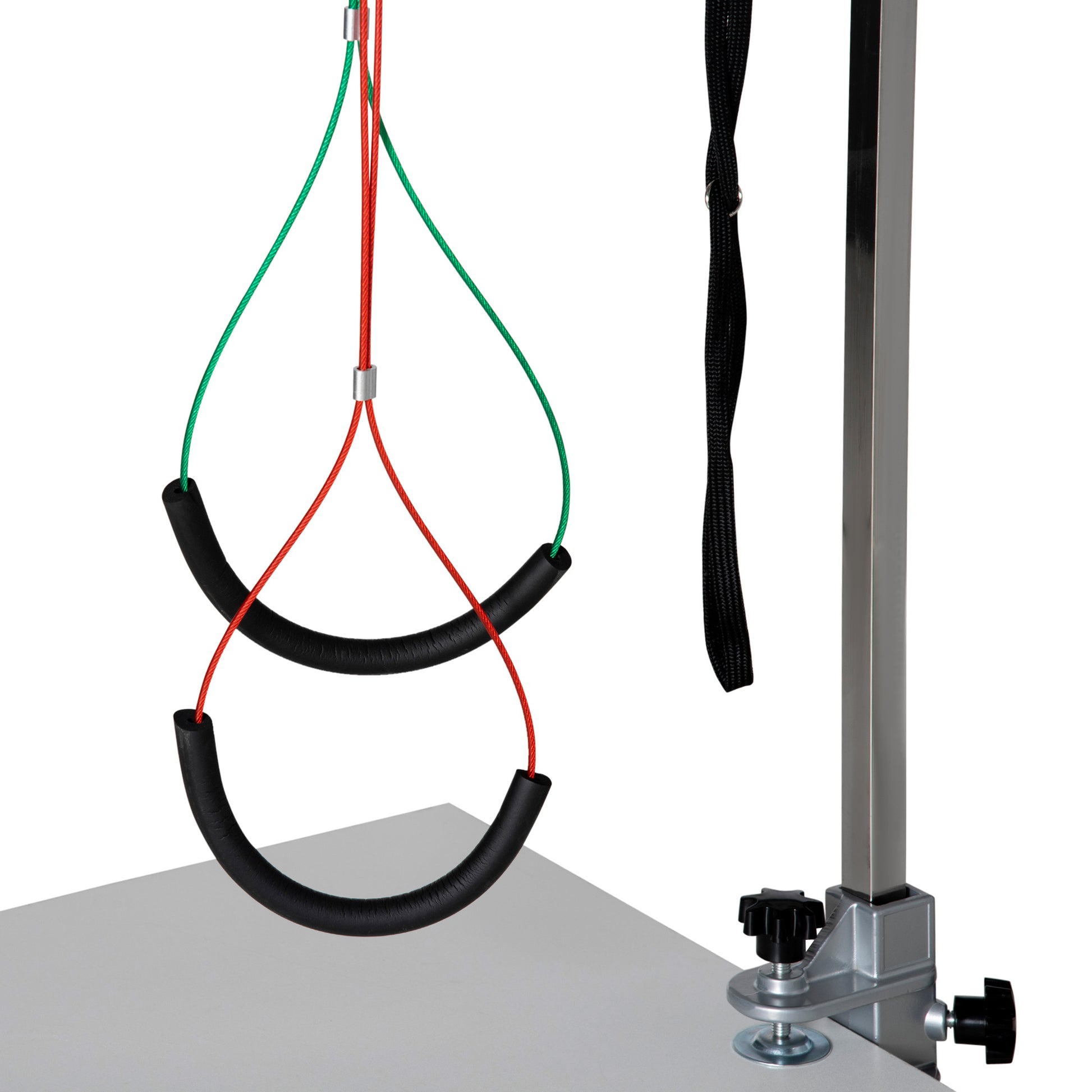- Haunch holders and grooming loop attached to bar to keep pets secure