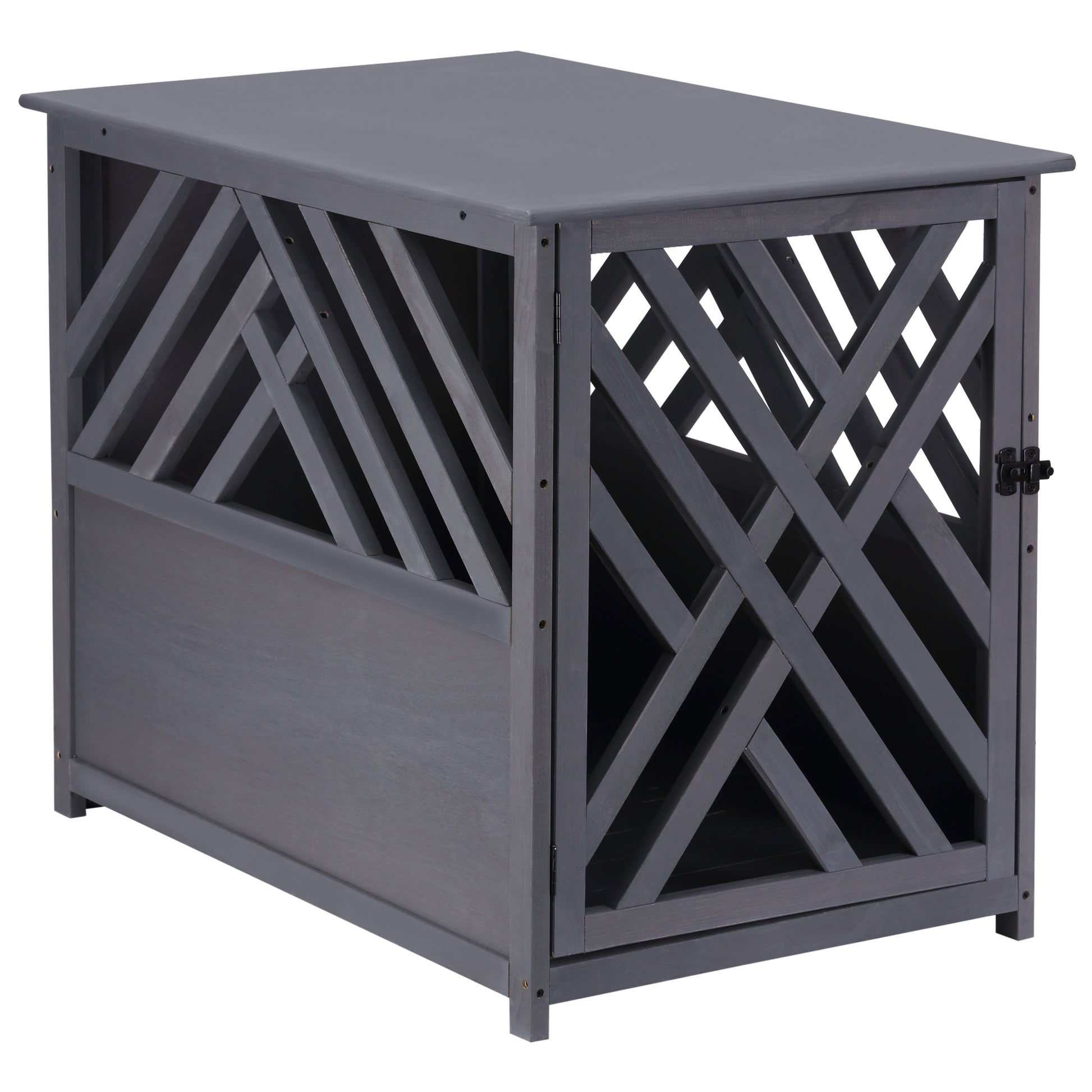 PawHut Furniture Style Wooden Dog Crate Kennel Top End Table Decorative Dog Cage Lattice Night Stand with Lockable Door, 60 x 91 x 74 cm, Grey