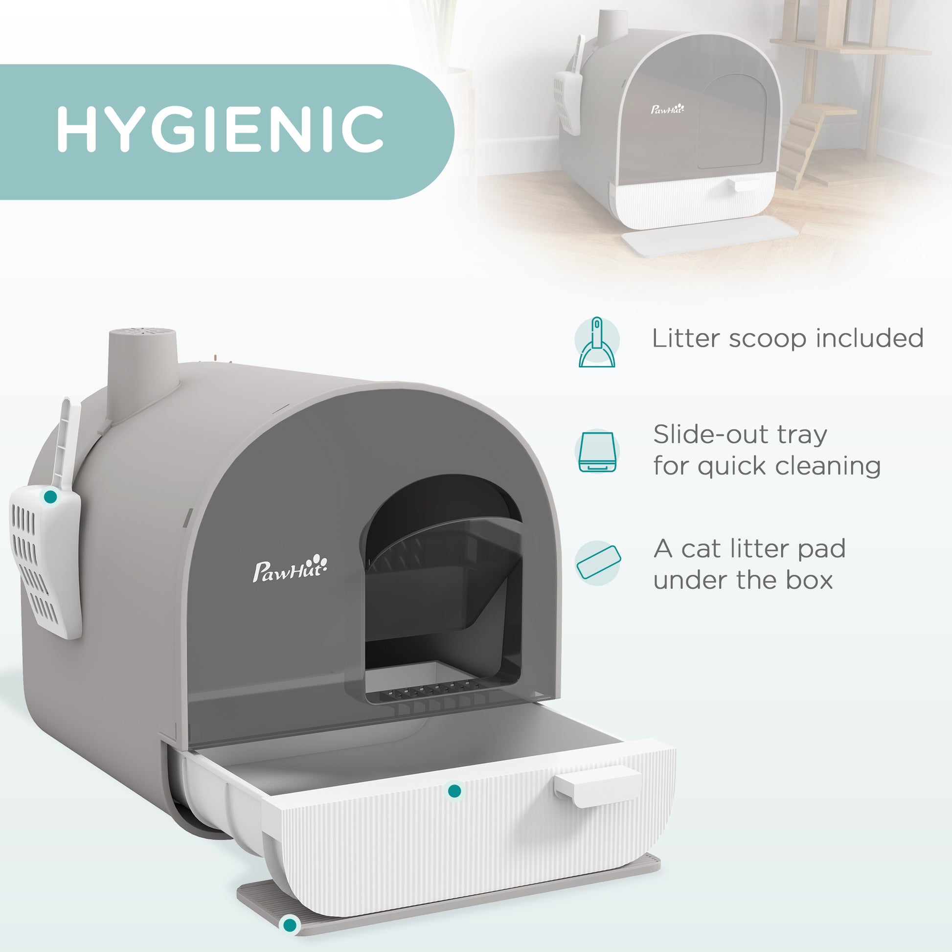 PawHut Hooded Cat Litter Box, Kitten Litter Tray, with Lid, Scoop, Filter, Flap Door, Light Grey