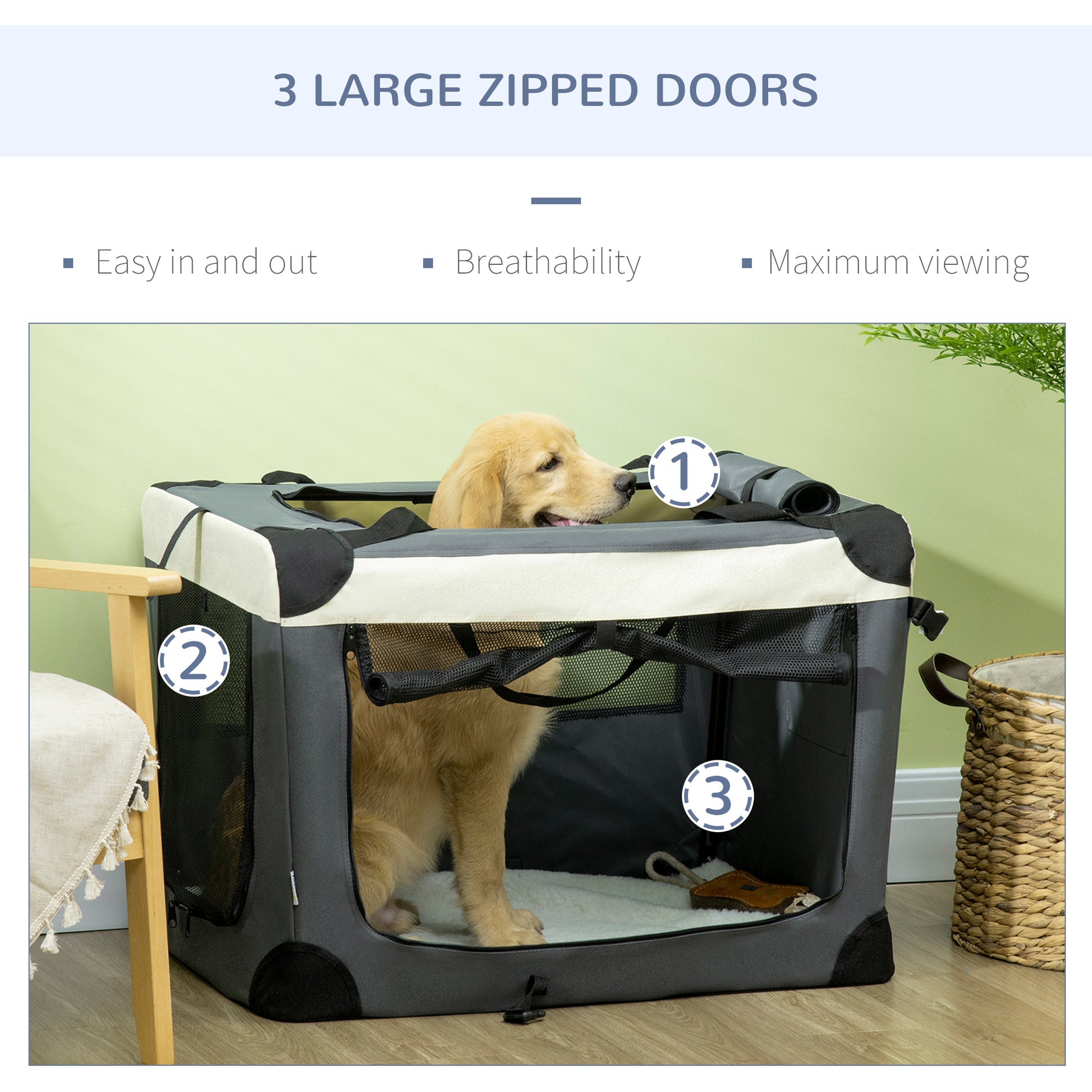 Struggle to travel with pets? With this PawHut fabric dog crate, you'll struggle no more. Its adjustable strap goes over your shoulder, so it's much easier carrying cats or medium dogs. Three doors for easy access – they'll enter a spacious area, where they'll relax on a soft cushion, whilst the air flows through the mesh window to keep them cool. It's foldable and comes with a bag, saving space when stored away. Not just for travelling, it can be used at home – a place for pets to lounge.