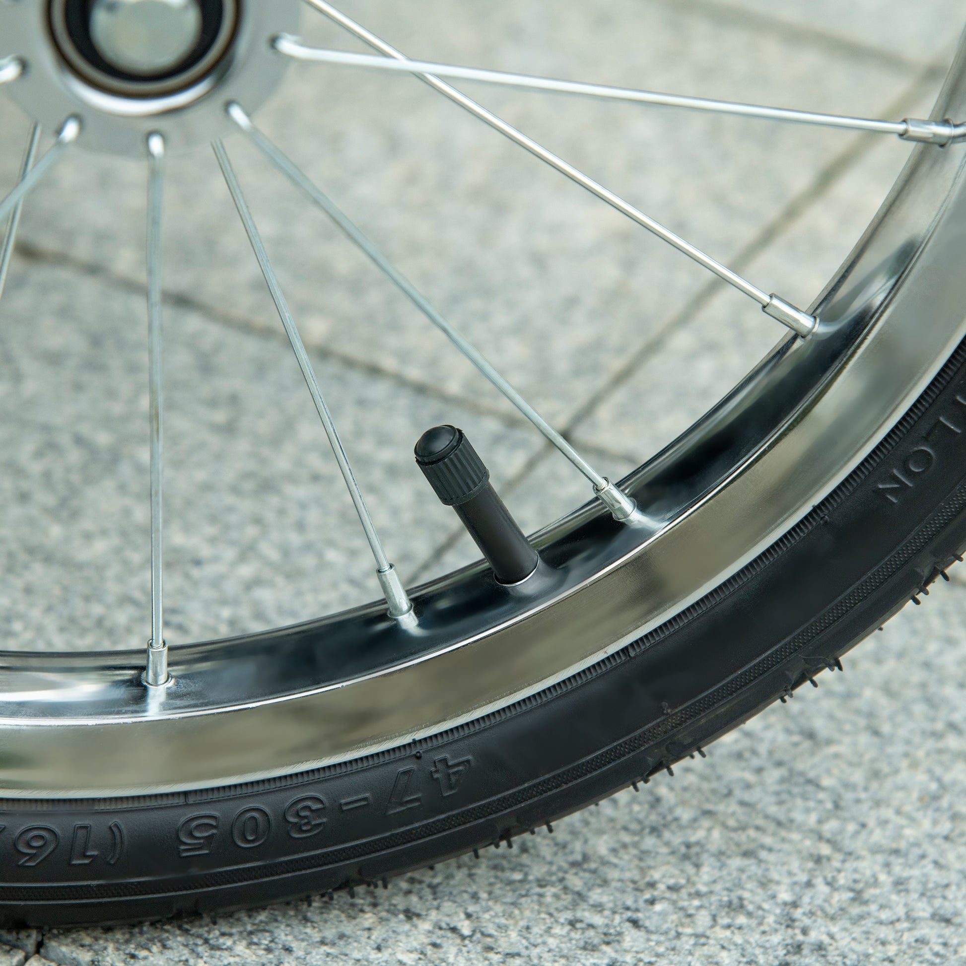 - Three large rubber wheels, suitable for all terrains. The front wheel is lockable
