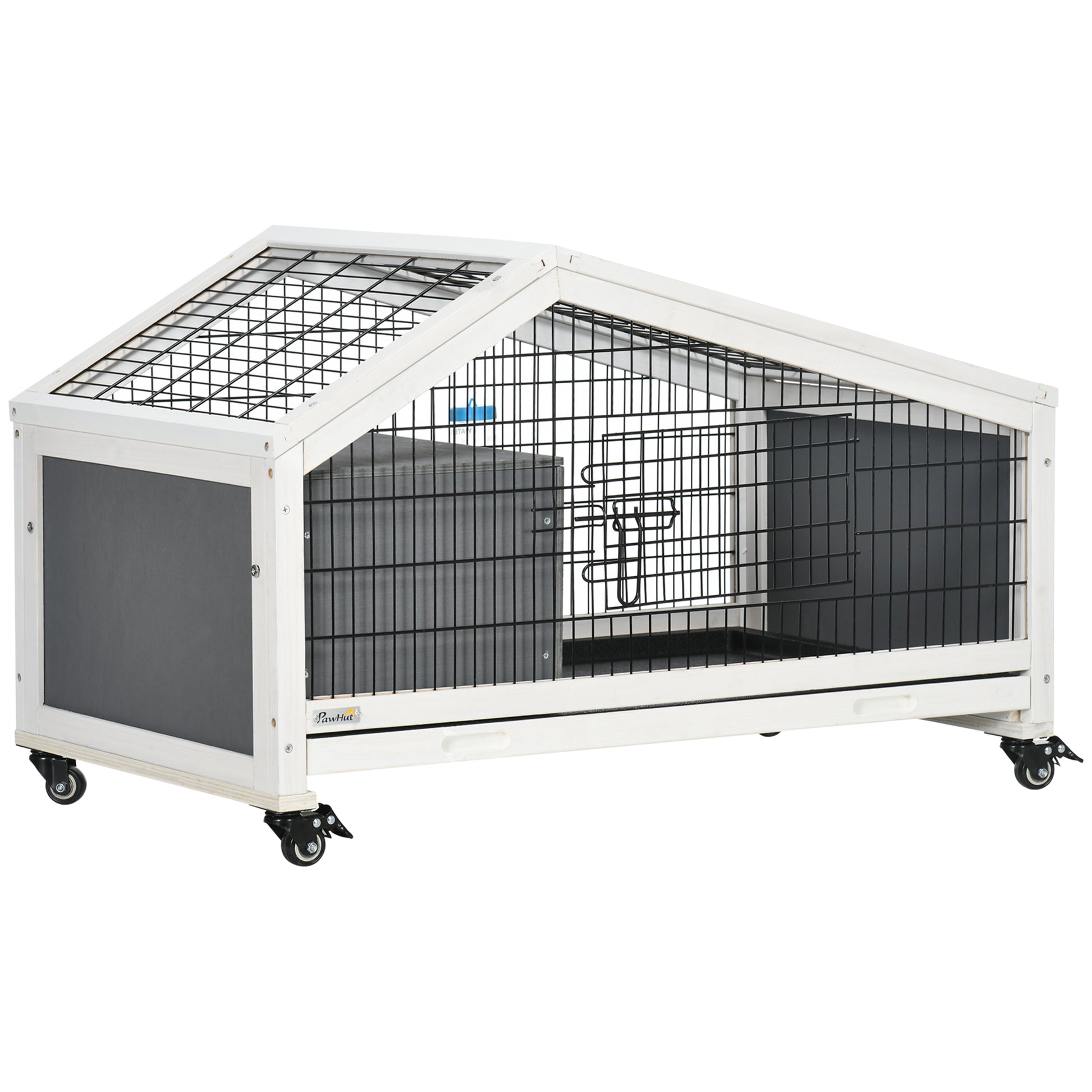 This indoor rabbit cage from PawHut is perfect for rabbits, guinea pigs, and other similar-sized animals. This small rabbit hutch is an ideal mix of safety and freedom and offers all the comforts of home, offering space to run and play. Lockable doors and slide-out trays provide easy cleaning and other routine tasks. Get your furry friend a comfortable living space from PawHut!